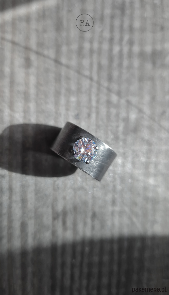 Kamień: zjawiskowy moissanit 1ct (ok. 6,5 cm średnicy) odbijający światło w sposób absolutnie zachwycający :)