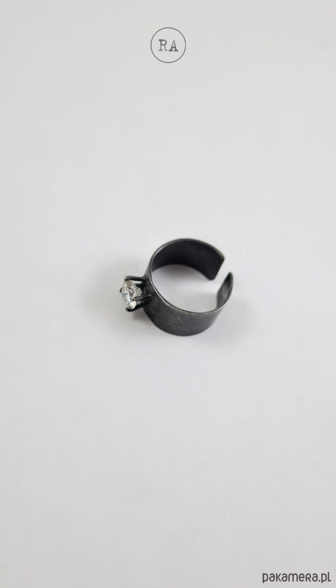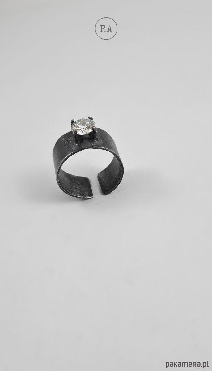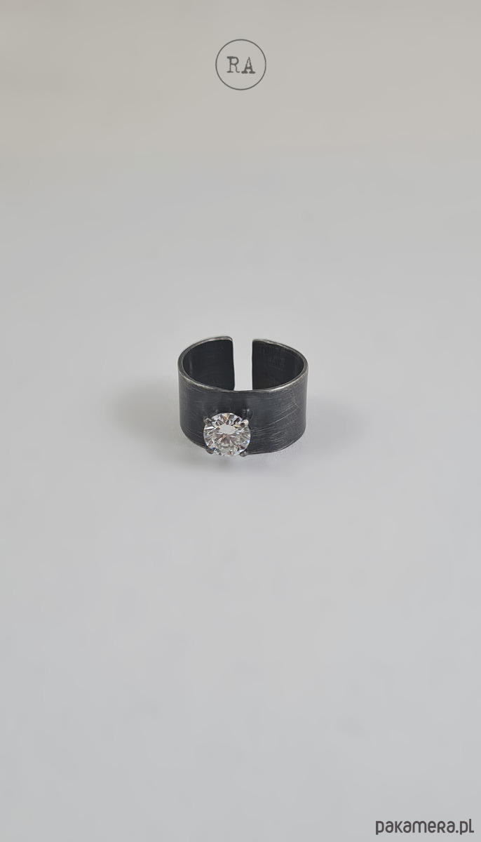 Pierścionek regulowany, wykonany ze srebra, o szerokości ok. 1 cm. Po zakupie prosimy o podanie rozmiaru, dopasujemy obrączkę.