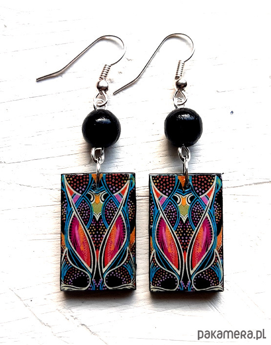 kolczyki drewniane, ozdobione metodą decoupage, dwustronne, starannie wykończone farbami akrylowymi i zabezpieczone wielokrotnie lakierem, koraliki drewniane, bigle posrebrzane, długość kolczyków bez bigli: 4 cm, szerokość: 1,5 cm, bardzo lekkie