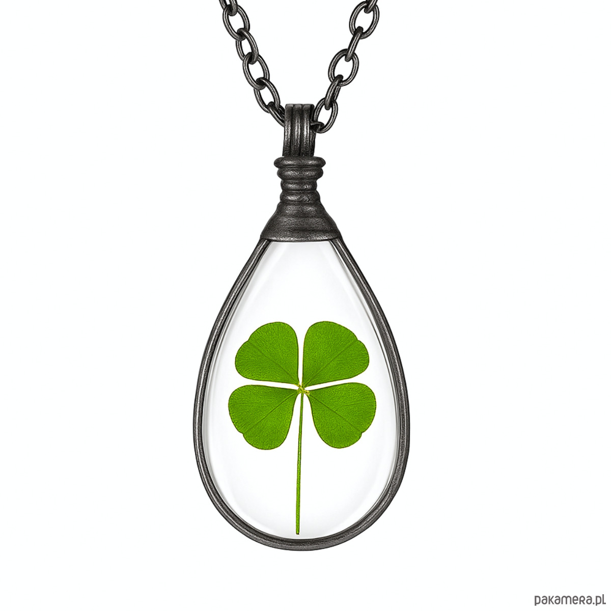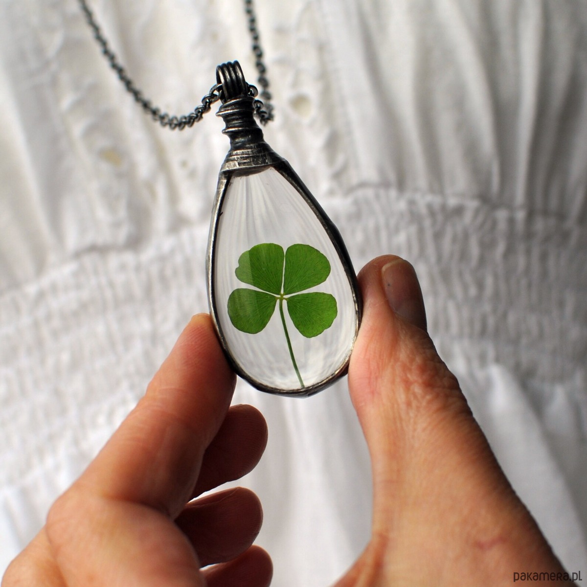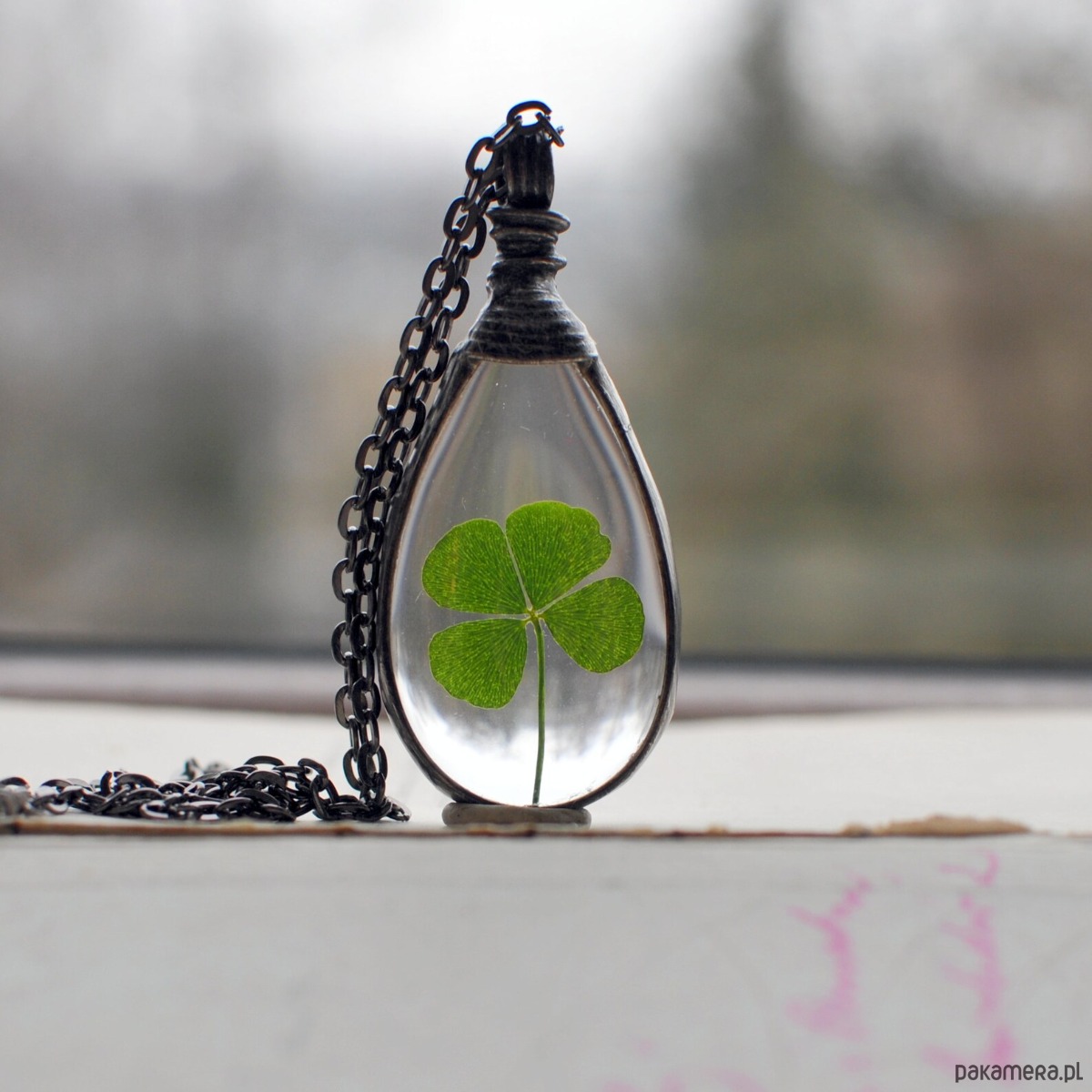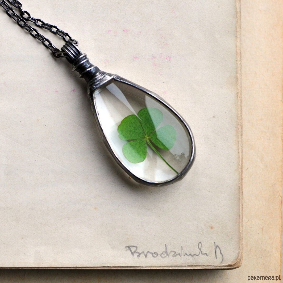 Za okrągłym szkłem umieszczona została prawdziwa, ususzona czterolistna koniczynka.