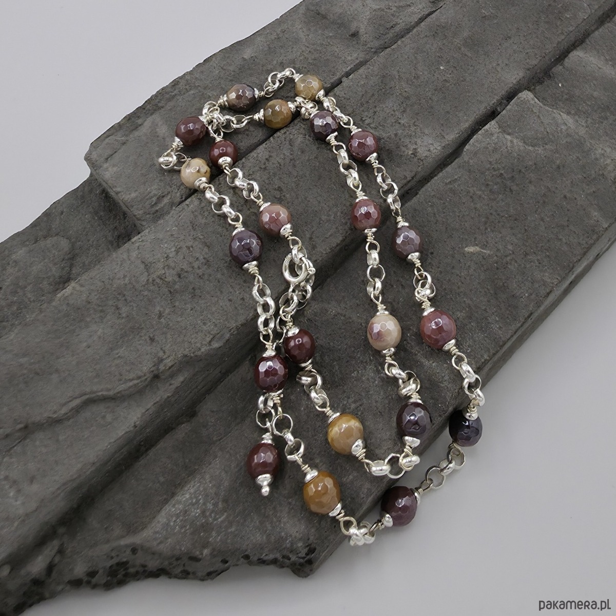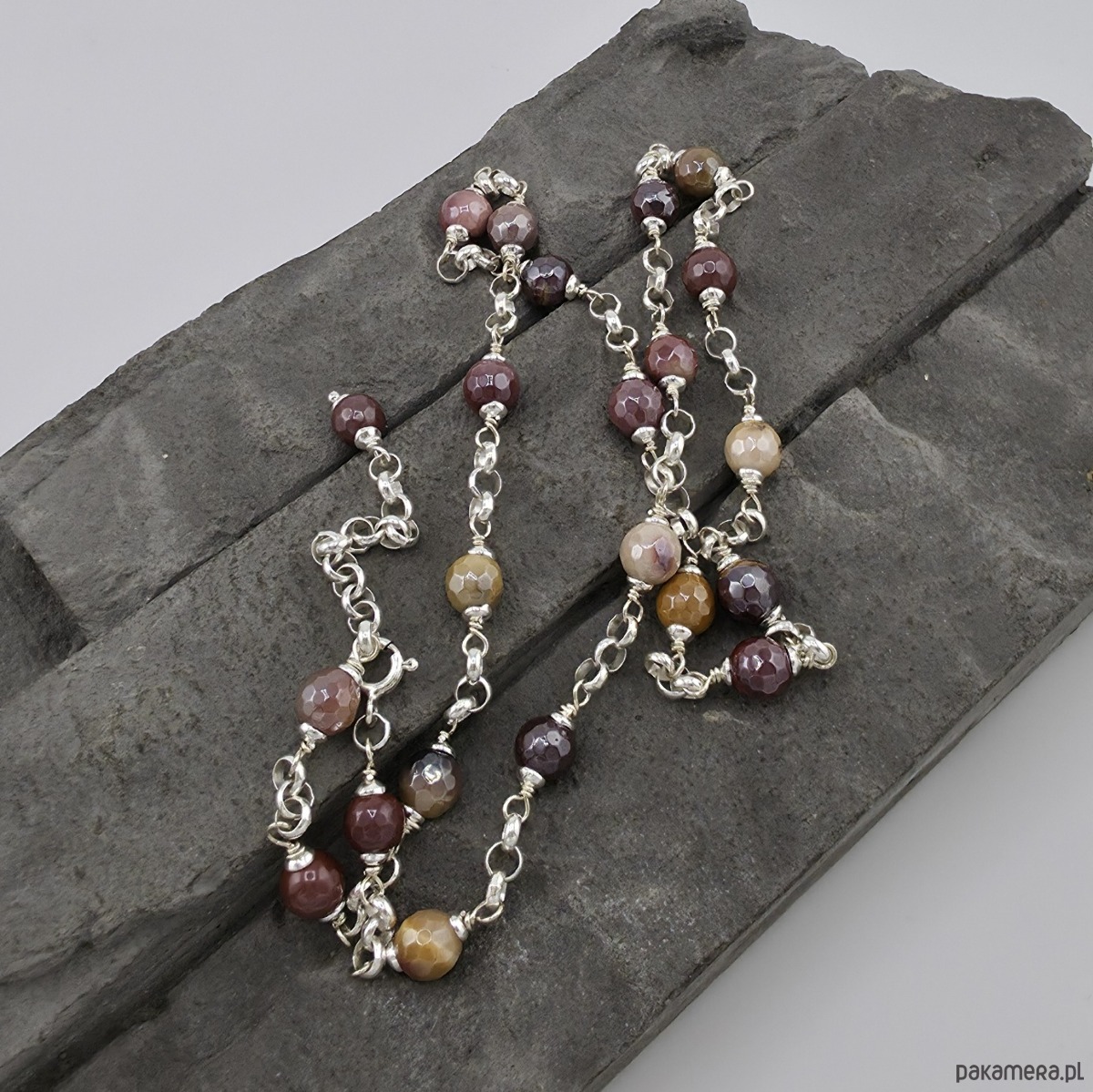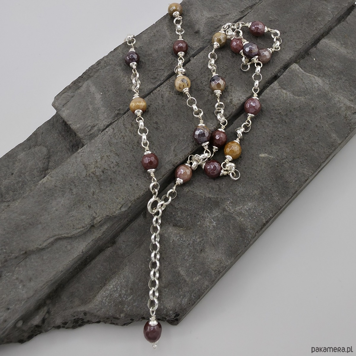 Kobiecy uniwersalny naszyjnik na każdą okazję. Wykonany w całości ze srebra próby 925 oraz fasetowanych kulek mokaitu wielkości ok. 0,6 cm. Solidny łańcuszek grubosci ok. 4 mm. Całkowita długość naszyjnika to ok. 48 cm plus 3 cm regulacji. Mozna nosic jako korale lub z wisiorkiem z przodu. Moge wykonac identyczny z innymi kamieniami. W mojej galerii bransoletka do kompletu. Ozdobnie zapakowany.
