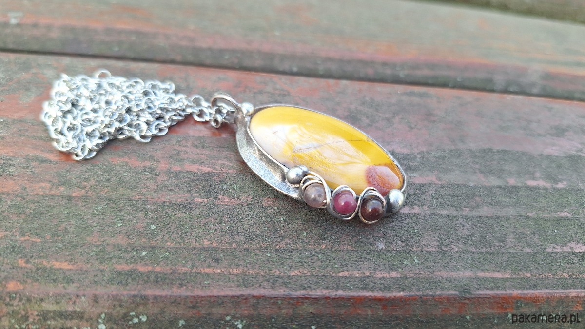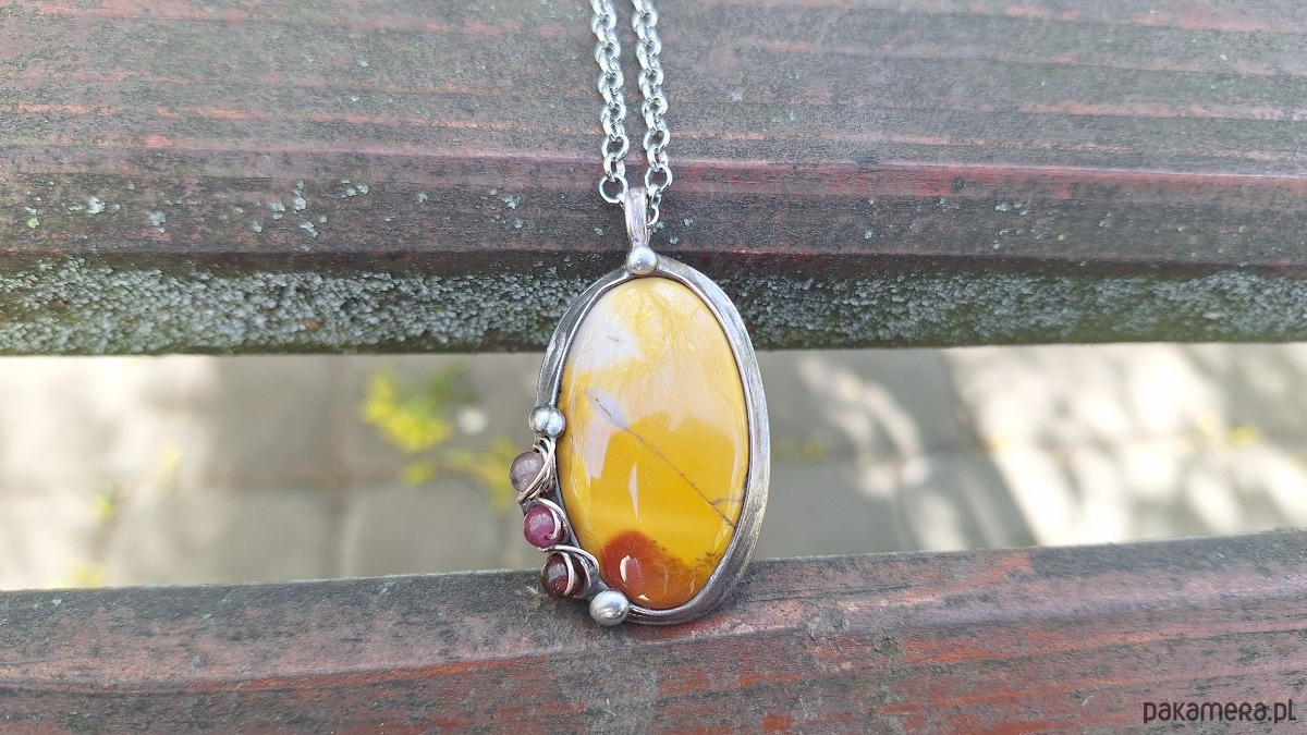Wisiorek wykonany z miedzi, cyny, turmalinów i jaspisu mokaitu. Wymiary ok. 4 na 2.5 cm. Zawieszony na łańcuszku o długości ok. 50 cm.