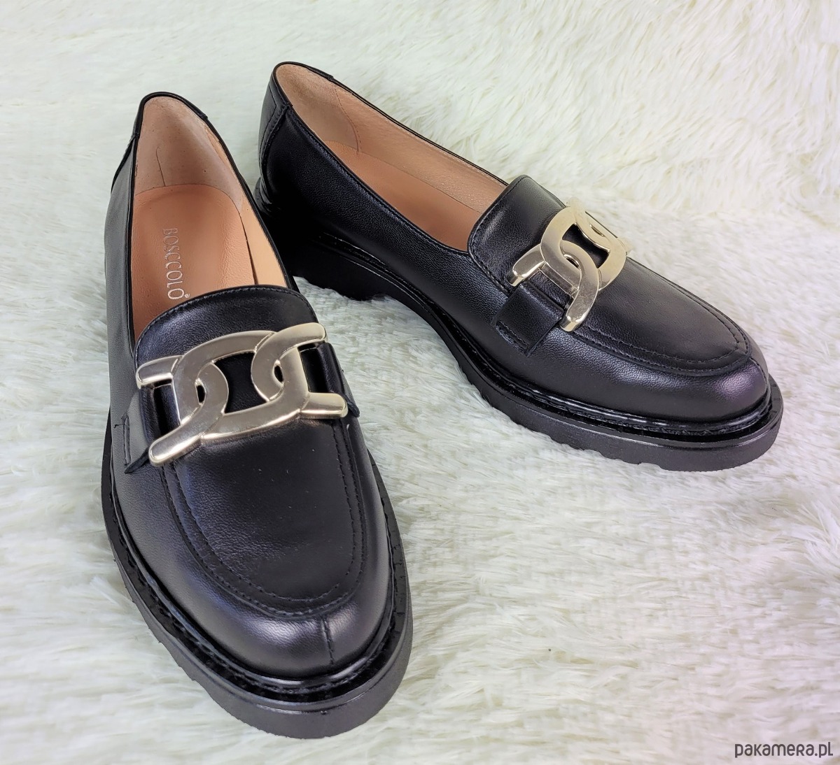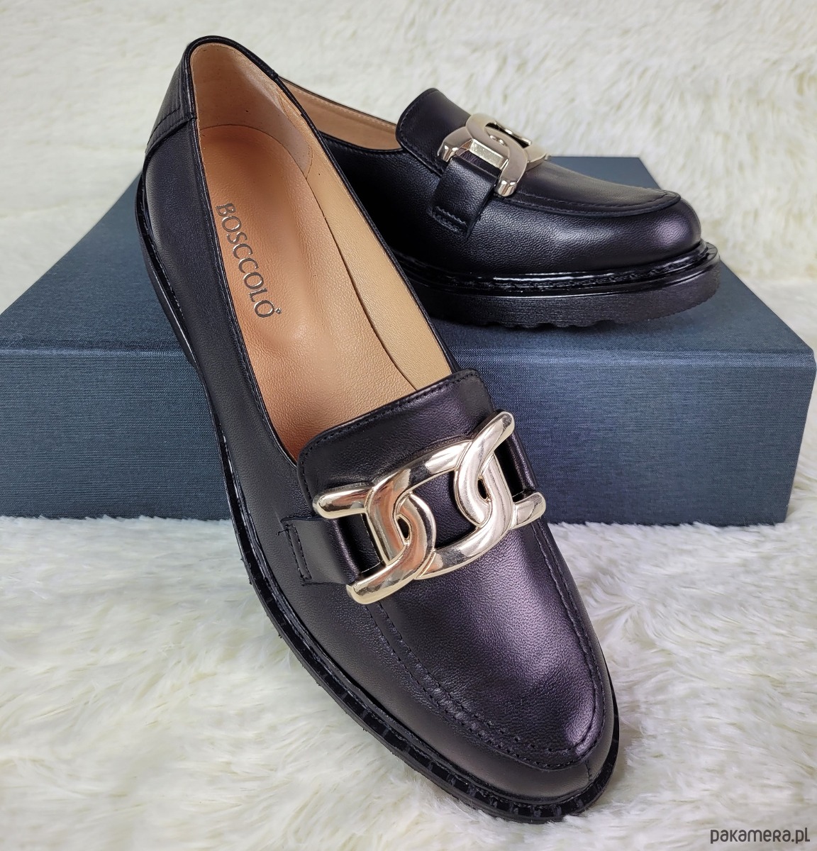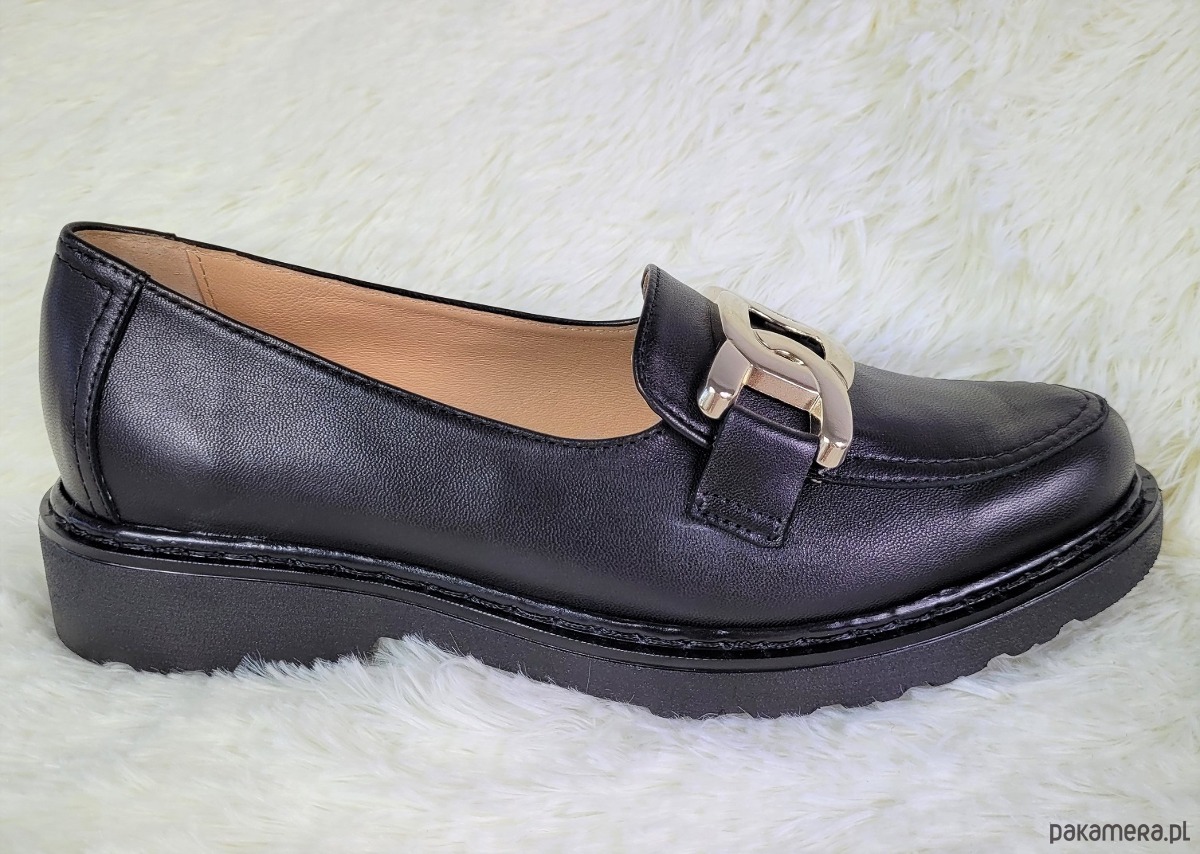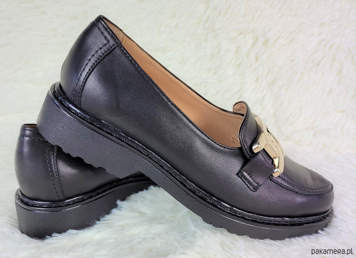 Eleganckie mokasyny damskie z naturalnej skóry z metalową złotą ozdobą