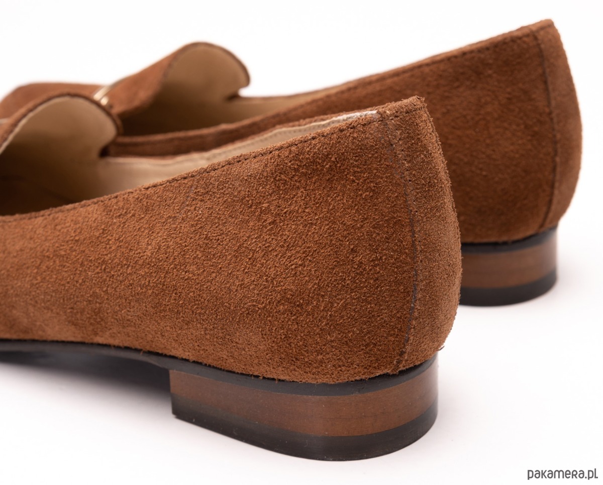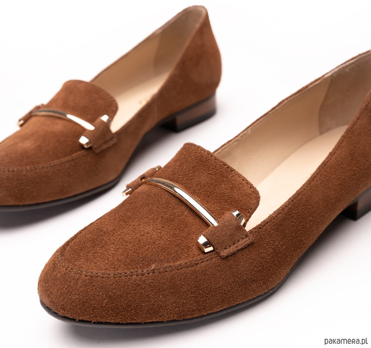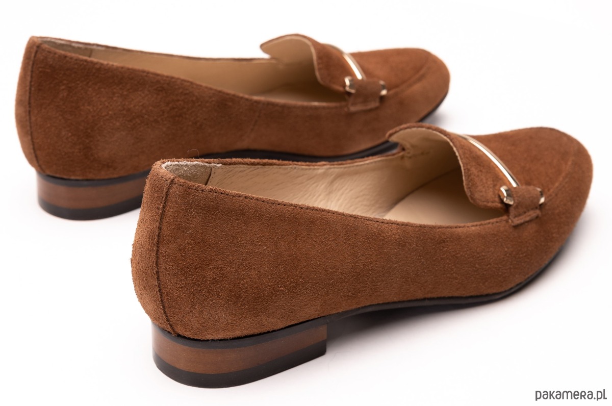 Eleganckie mokasyny damskie z naturalnej skóry zamszowej z metalową ozdobą.