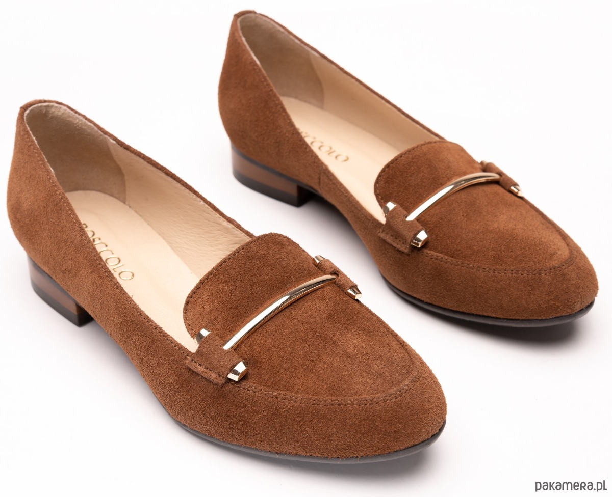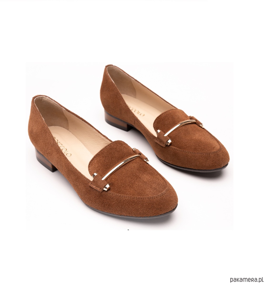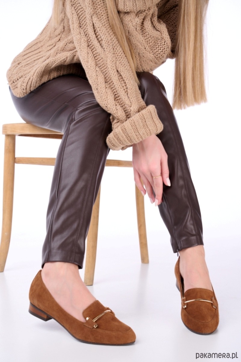 Eleganckie mokasyny damskie z naturalnej skóry zamszowej z metalową ozdobą.