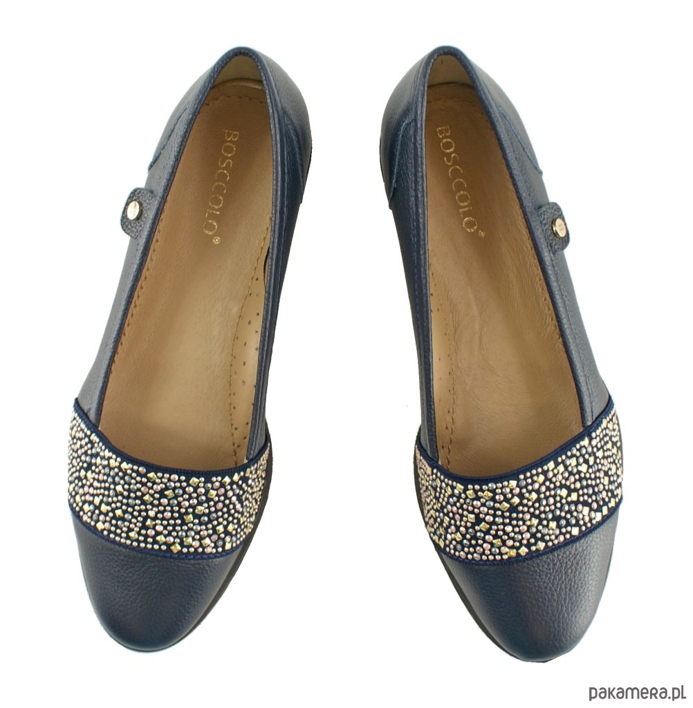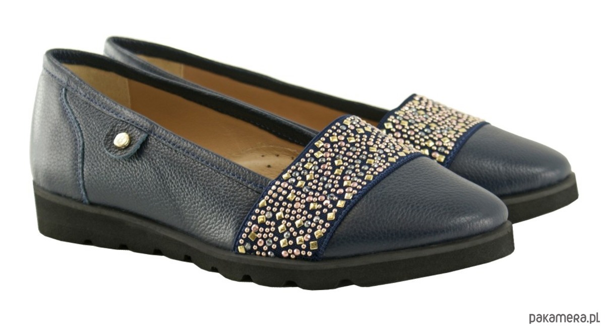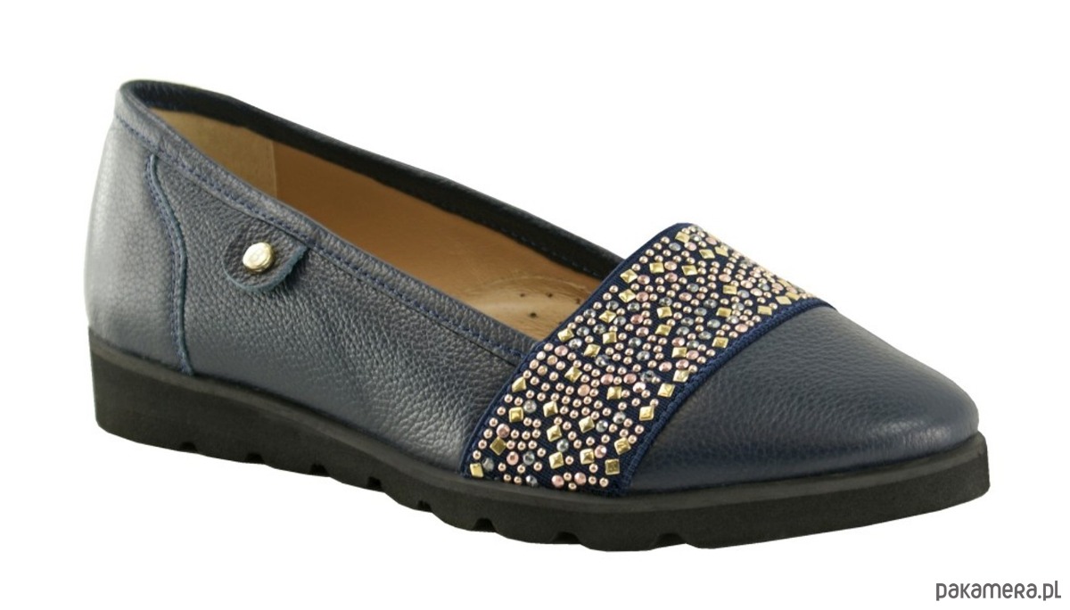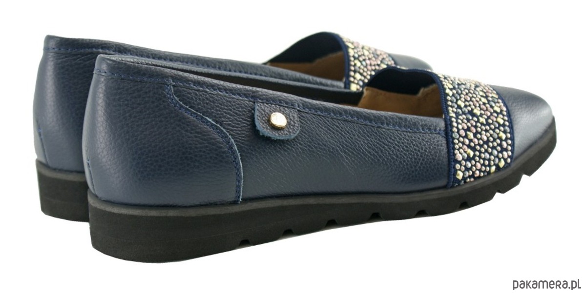 Mokasyny ze skóry naturalniej, licowej, wszyta gumka z ozdobnymi dżetami, która pozwala na idealne dopasowanie do wysokości podbicia.