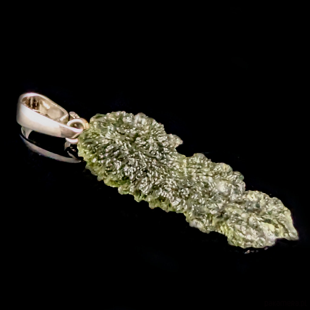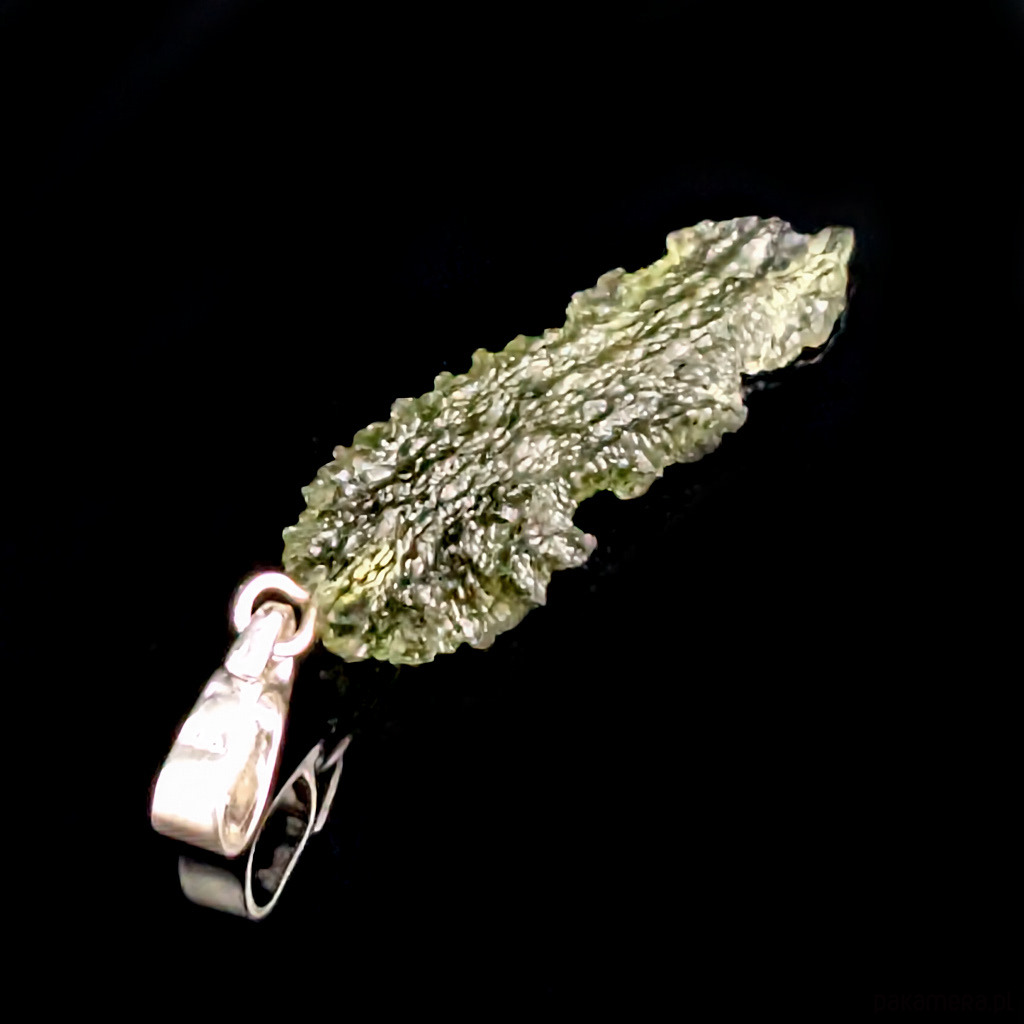 Surowy okaz jakościowego, przejrzystego mołdawitu. Piękna struktura kamienia. Wymiary oprawy 27 x 10 mm, z krawatką długość 35 mm. Waga 1,23 g. Krawatka srebro pr. 925. Wisiorek zostanie wysłany w ozdobnym pudełeczku.