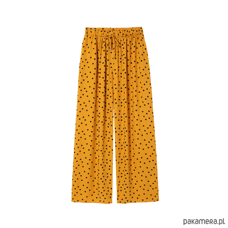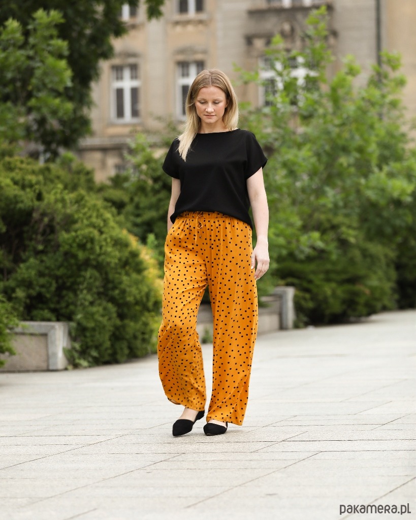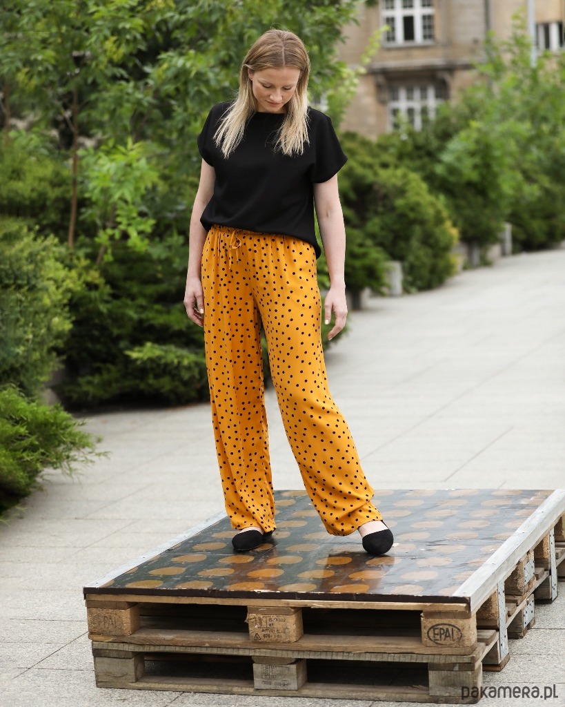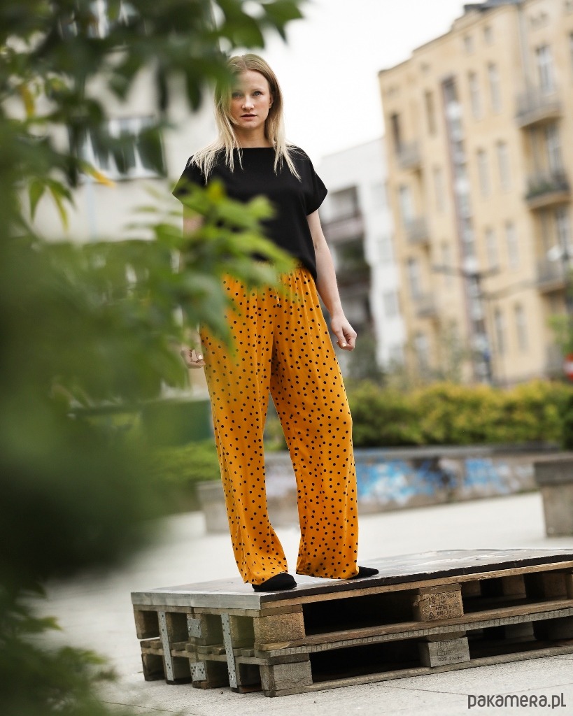 Bardzo wygodne, długie spodnie wykonane z wysokogatunkowej tkaniny wiskozowej. Materiał jest lekki i zwiewny z wyczuwalną fakturą, tło w odcieniu ochry z czarnymi nieregularnymi kropkami. Spodnie są bardzo przyjemne w użytkowaniu i pięknie się układają. Można je nosić na co dzień, ale z powodzeniem sprawdzą się też w eleganckich stylizacjach na większe wyjścia.