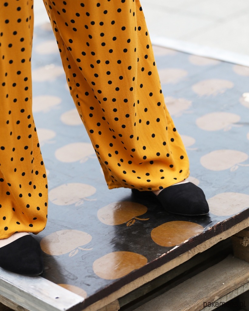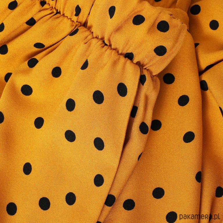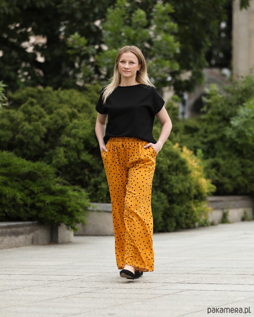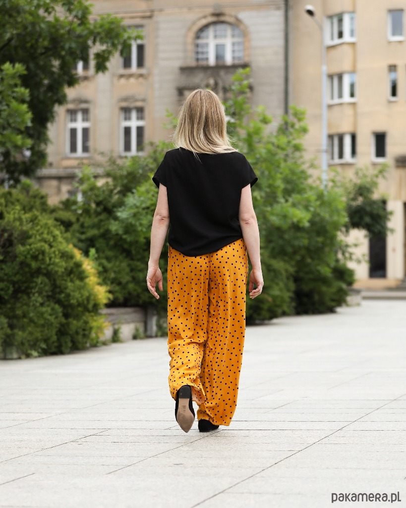 Bardzo wygodne, długie spodnie wykonane z wysokogatunkowej tkaniny wiskozowej. Materiał jest lekki i zwiewny z wyczuwalną fakturą, tło w odcieniu ochry z czarnymi nieregularnymi kropkami. Spodnie są bardzo przyjemne w użytkowaniu i pięknie się układają. Można je nosić na co dzień, ale z powodzeniem sprawdzą się też w eleganckich stylizacjach na większe wyjścia.