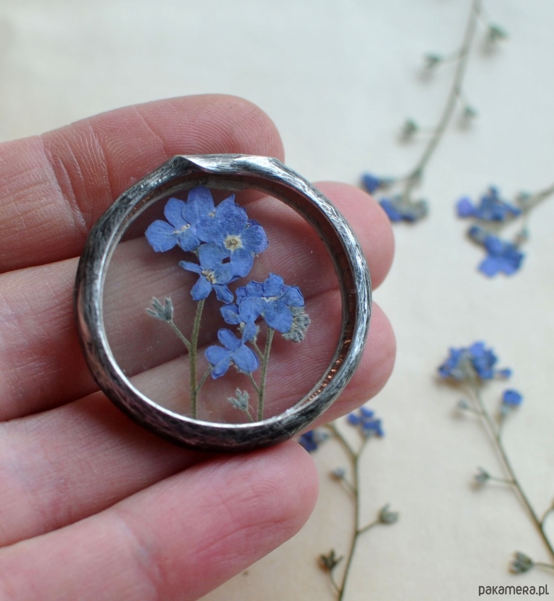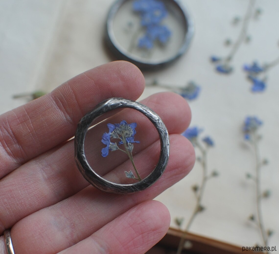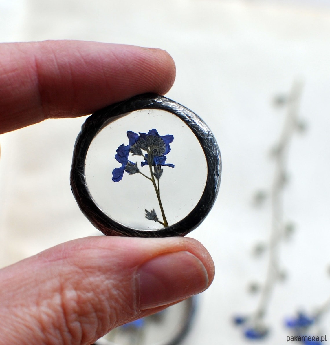 Za okrągłym szkłem umieszczona została niezapominajka.