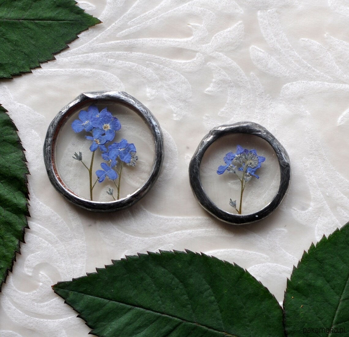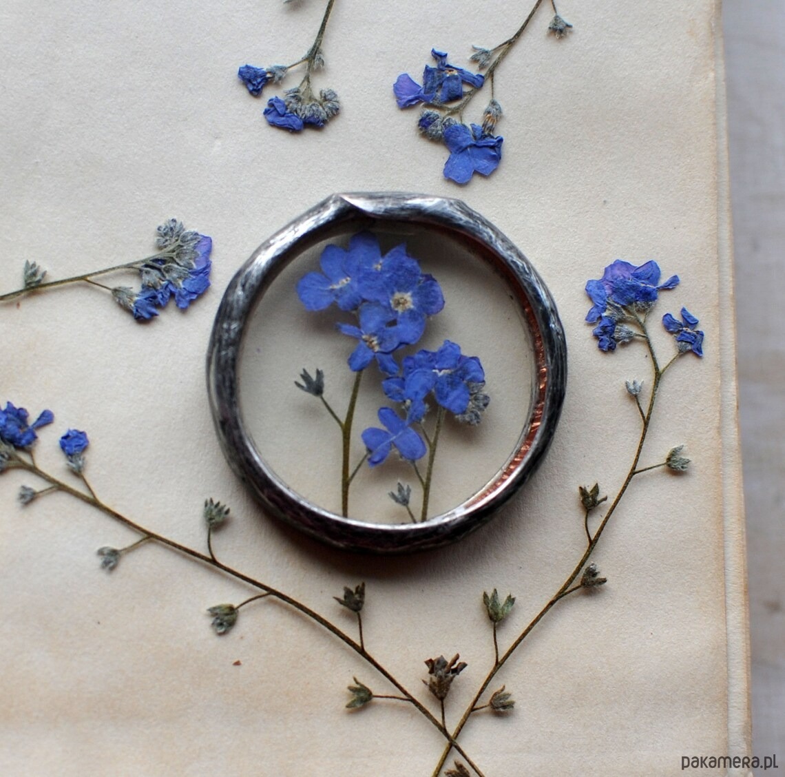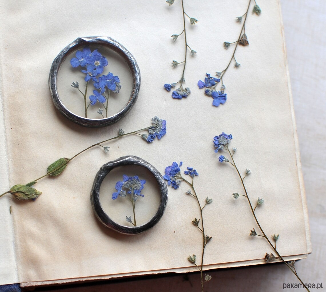 Za okrągłym szkłem umieszczona została niezapominajka.