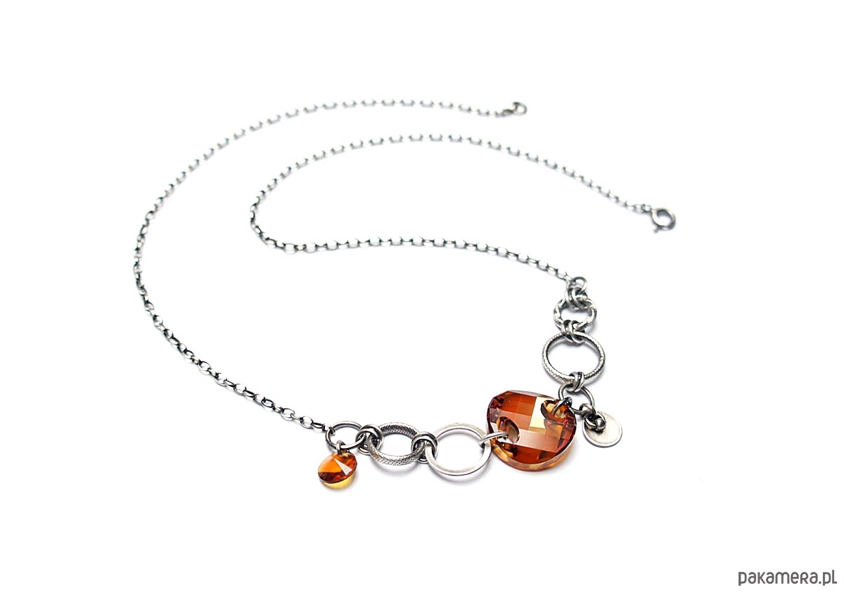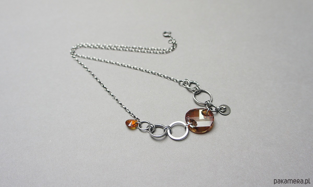 Naszyjnik wykonany ze srebra [pr. 925] w połączeniu z kryształkiem Swarovski [18mm], oraz ze srebrnymi blaszkami i ogniwami [8mm -13mm]. Całość oksydowana i przetarta. Całkowita długość naszyjnika 48,5 cm. Biżuteria ozdobnie zapakowana. Naszyjnik skomponowany tak, by mógł stanowić komplet z drugim naszyjnikiem widocznym na zdjęciach.