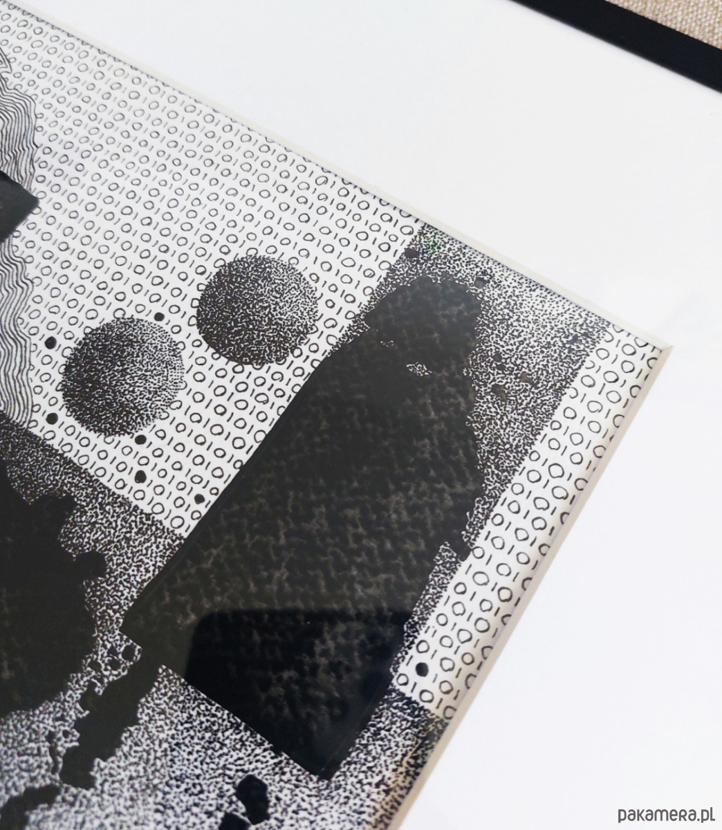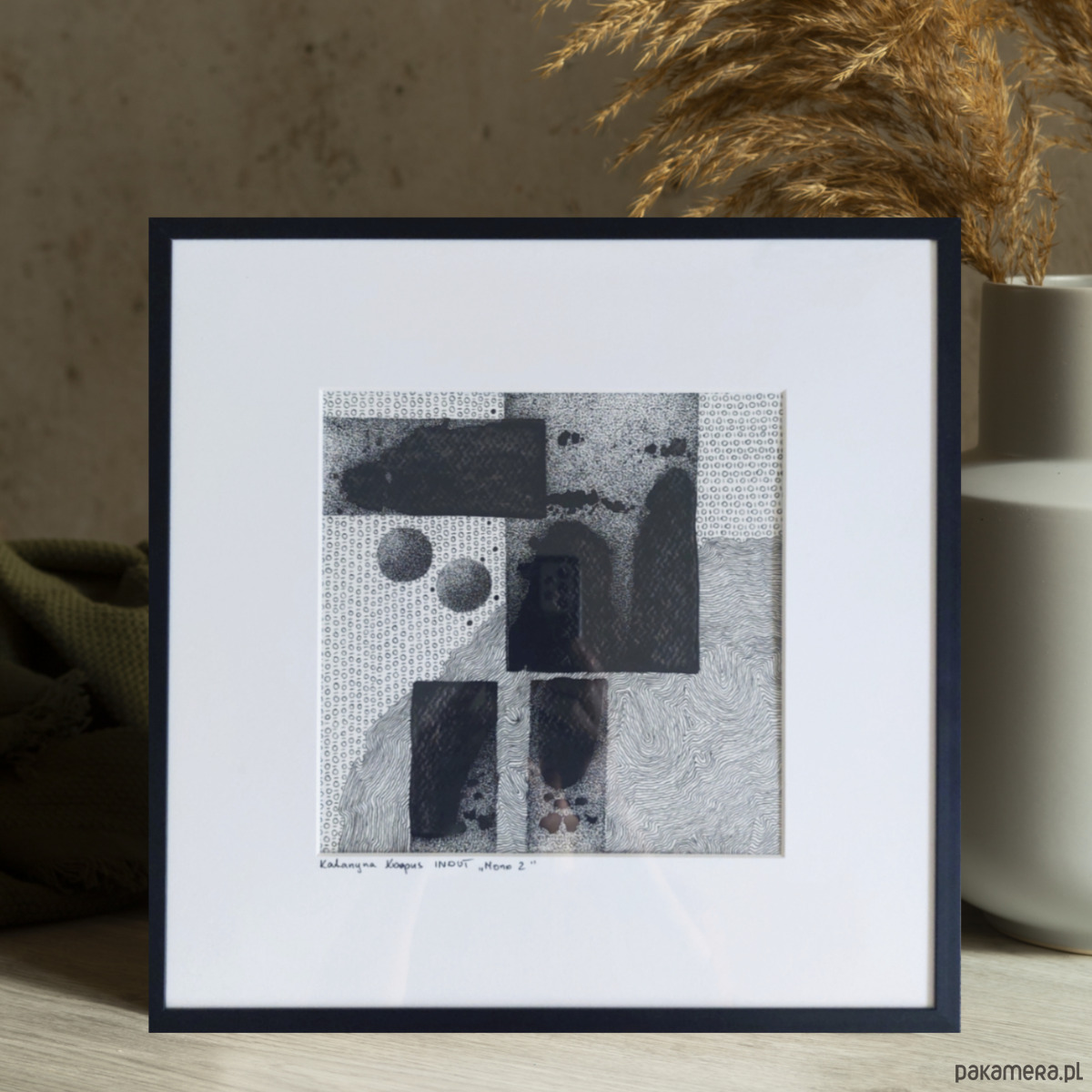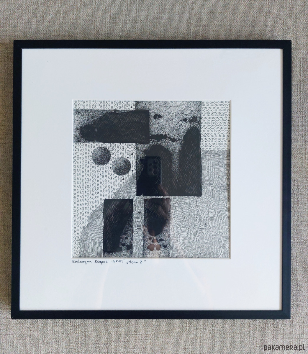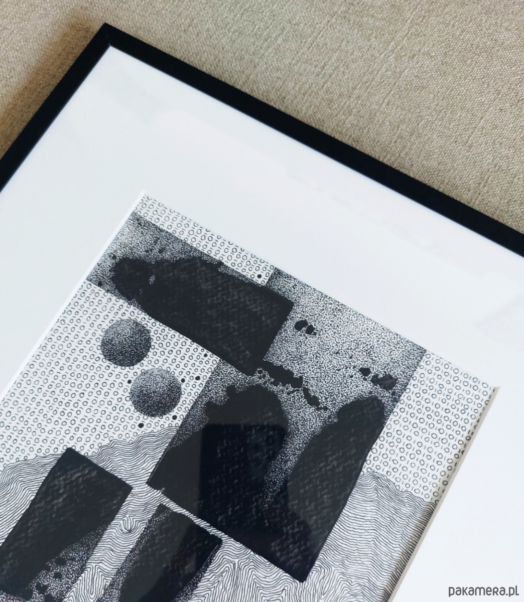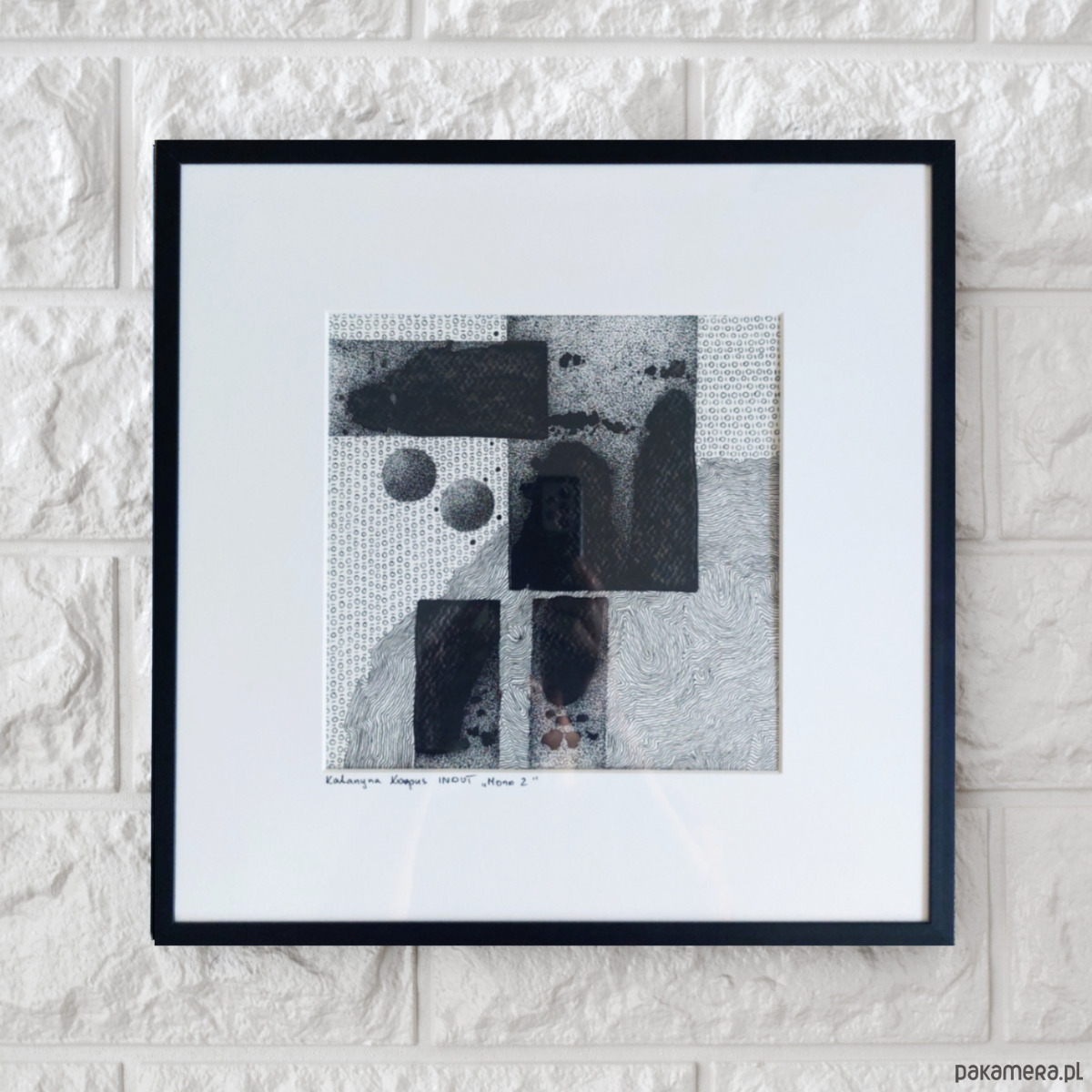 MONO 2 to czarno-biała abstrakcja ręcznie malowana na grubym papierze. Oprawiona jest w kwadratową ramkę w kolorze czarnym oraz białe passepartout, które podkreśla kontrastową kolorystykę całości.