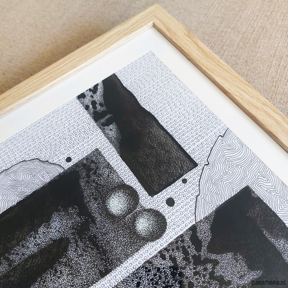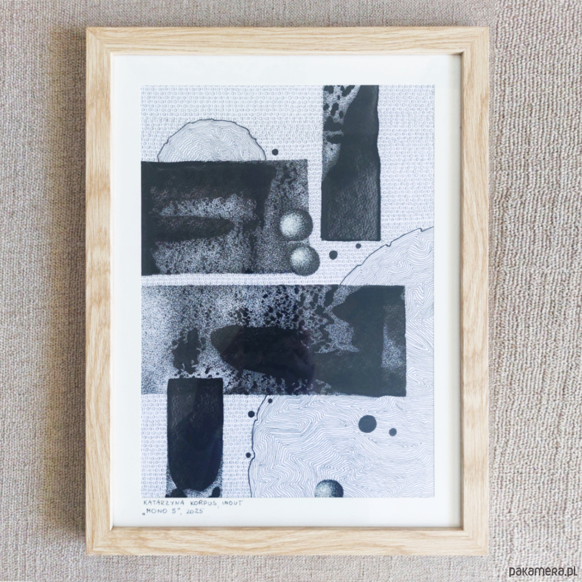 MONO 5 to czarno-biała abstrakcja ręcznie malowana na grubym papierze pełna detalu i kontrastu. Oprawiona jest w ramę w kolorze naturalnego drewna oraz białe passepartout, które pięknie podkreślają całość - świetnie sprawdzi się we wnętrzach boho, minimalistycznych czy loftowych, na czerni, bieli, cegle czy betonie. Jest pełna detalu, więc nie tylko dopełni Twój dom, ale będzie też unikatową dekoracją :)