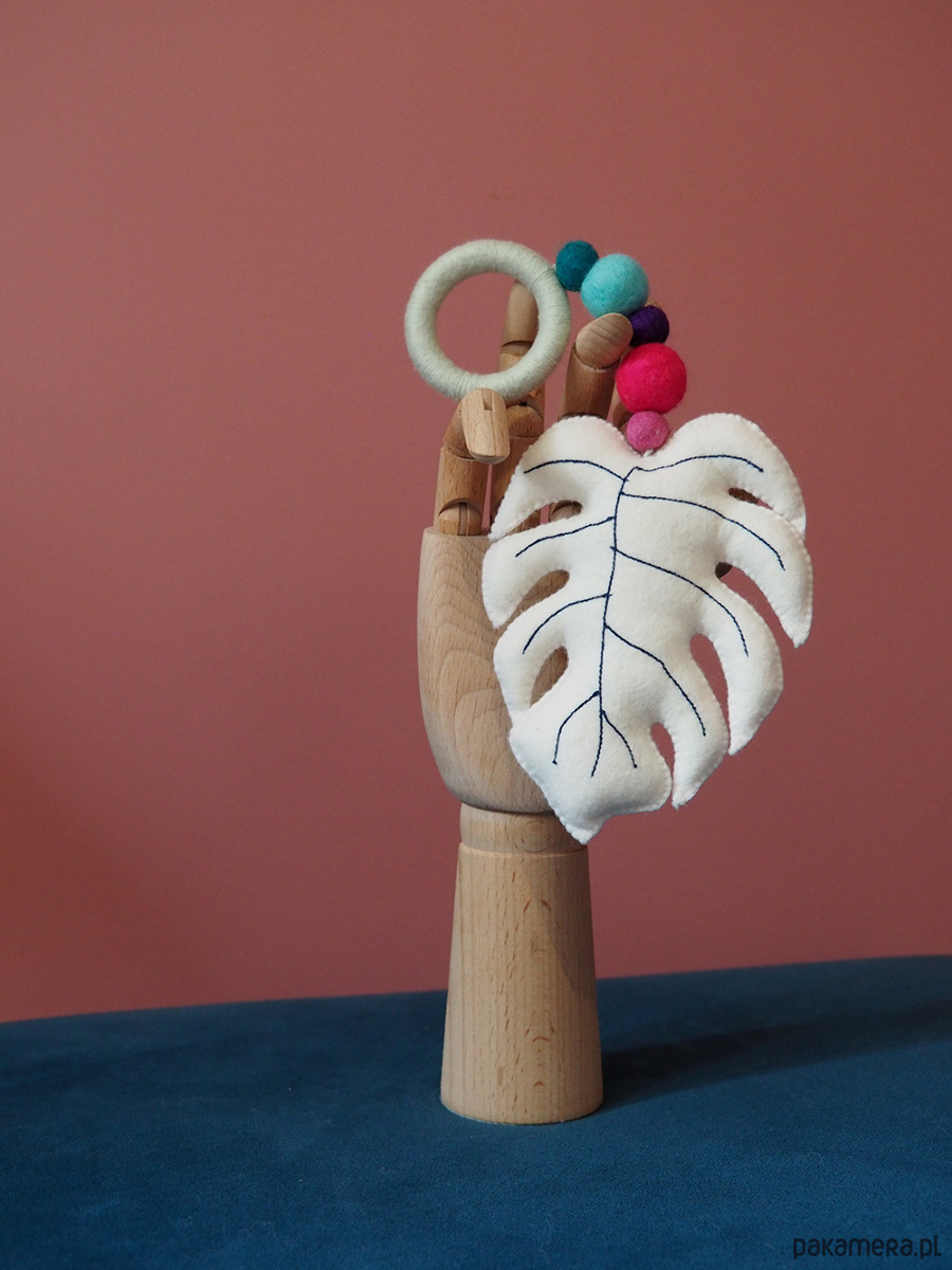 -wielkość liścia: ok. 15 cm x 11 cm, pomponowy sznur z gryzakiem o długości 14 cm