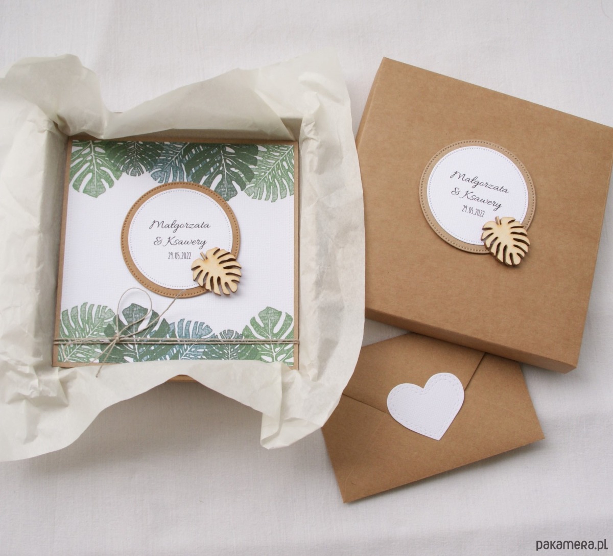 Monstera -kartka, personalizacja, pudełko, koperta