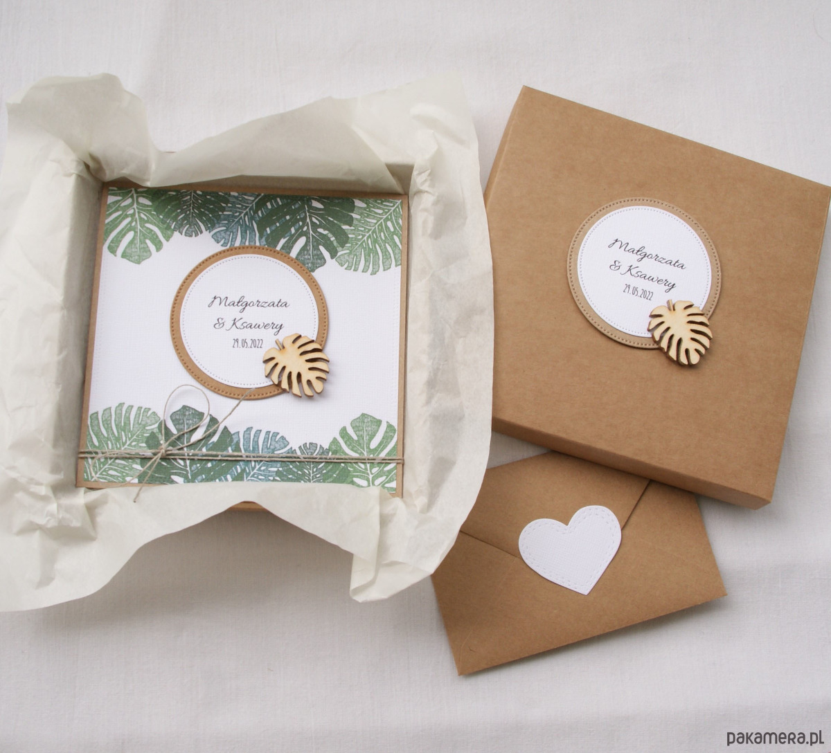 Monstera -kartka, personalizacja, pudełko, koperta