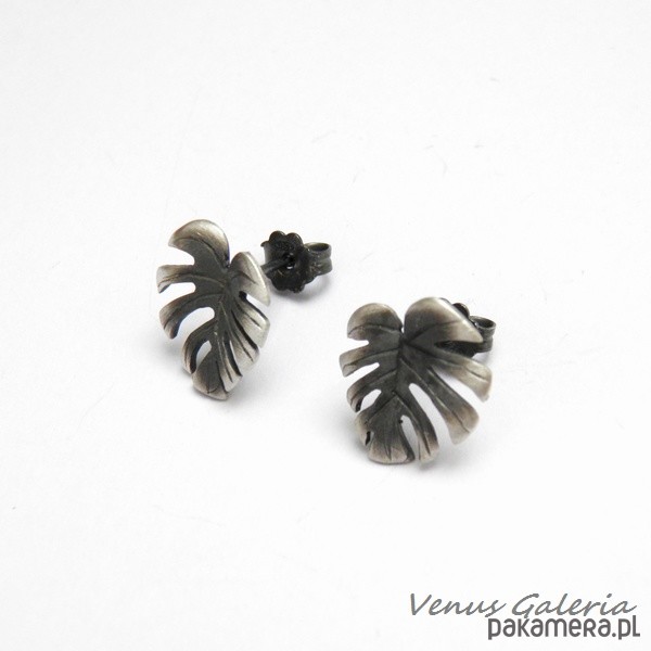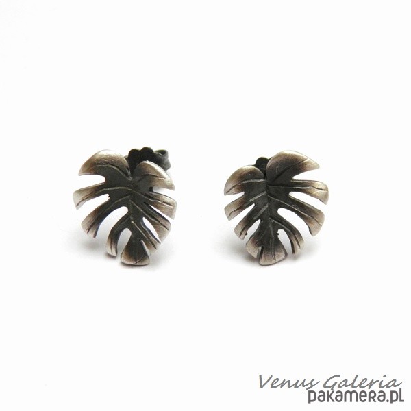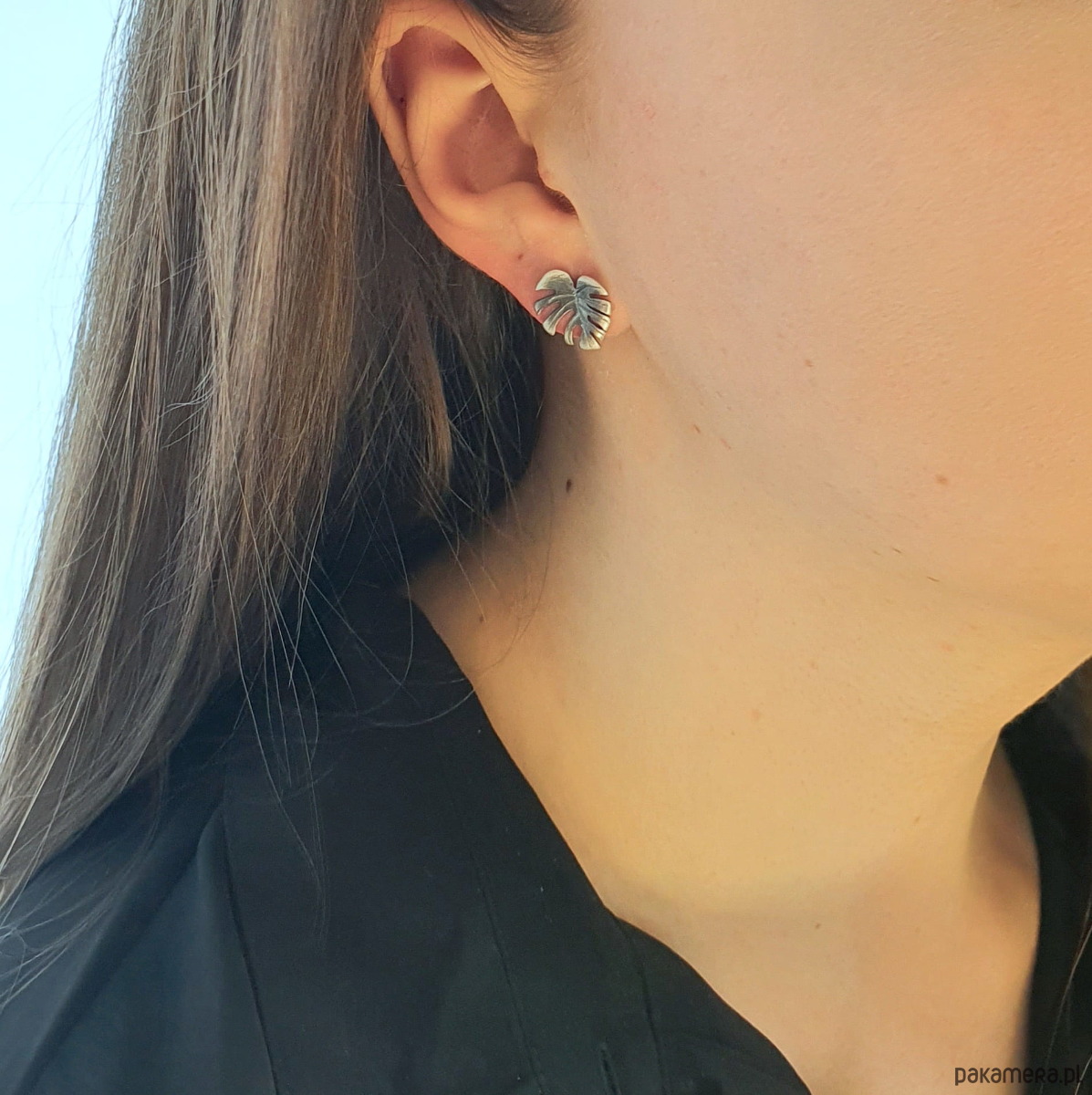 Kolczyki wykonane ze srebra próby 925 w kształcie liścia monstery na sztyftach.