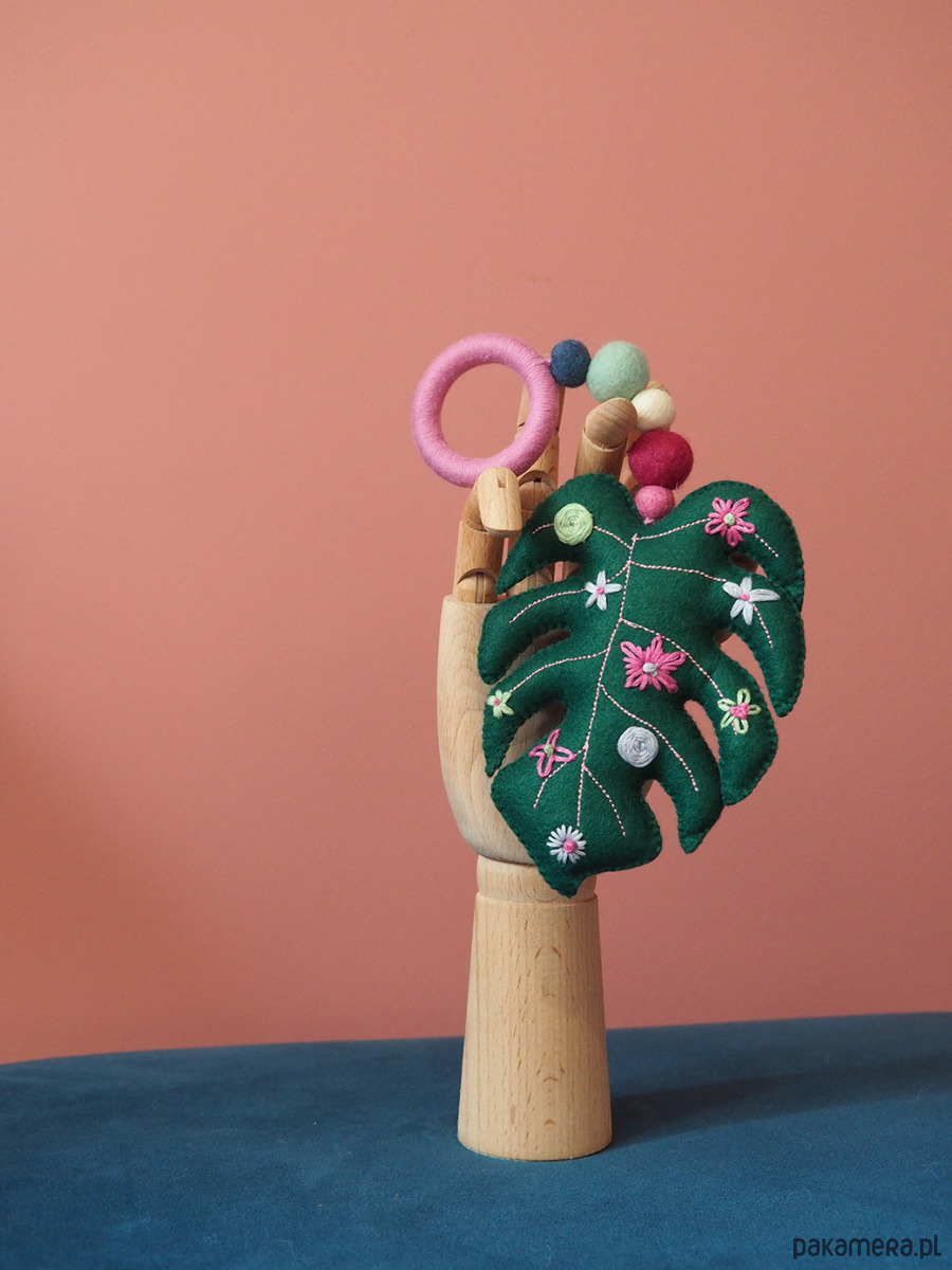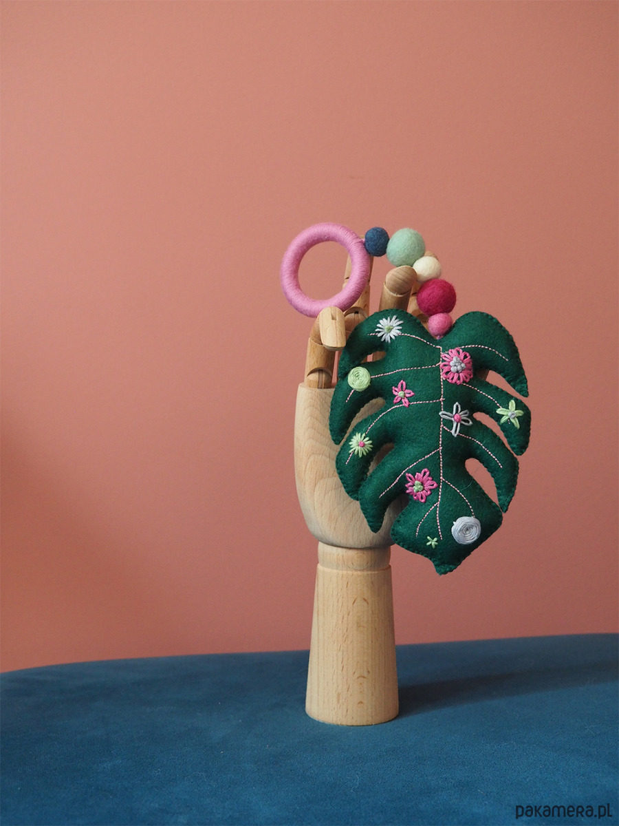 -wielkość liścia: ok. 15 cm x 11 cm, pomponowy sznur z gryzakiem o długości 14 cm