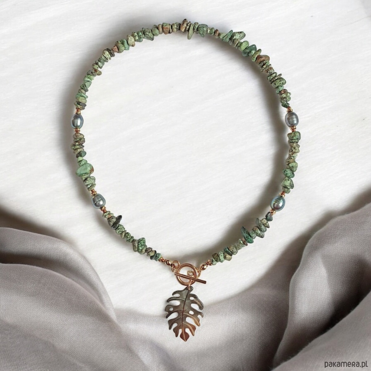 Piękny naszyjnik wykonany z połączenia nieregularnych elementów turkusu afrykańskiego, ciemnych pereł słodkowodnych (ok. 10mm) i rzeźbionej monstery z ciemnej, lekko opalizującej muszli (ok. 37mm) oraz przekładek ze złotego hematytu.