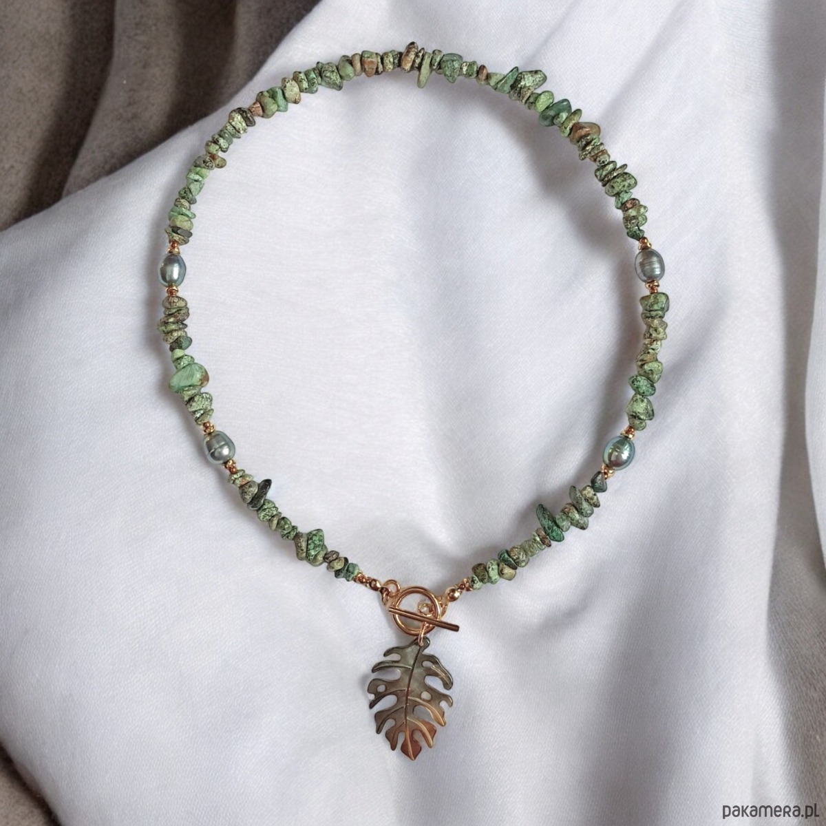Piękny naszyjnik wykonany z połączenia nieregularnych elementów turkusu afrykańskiego, ciemnych pereł słodkowodnych (ok. 10mm) i rzeźbionej monstery z ciemnej, lekko opalizującej muszli (ok. 37mm) oraz przekładek ze złotego hematytu.