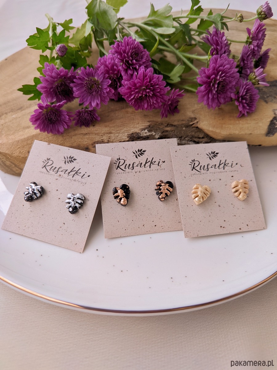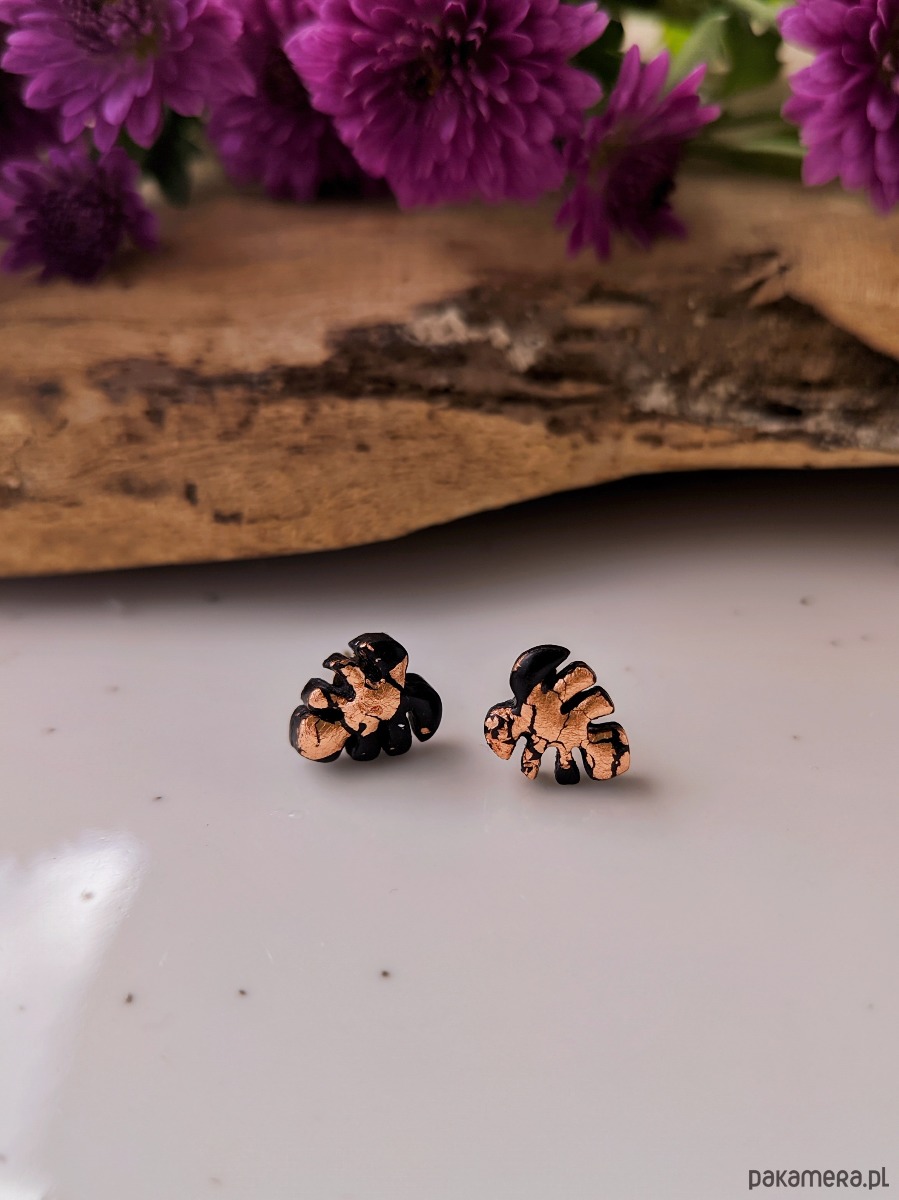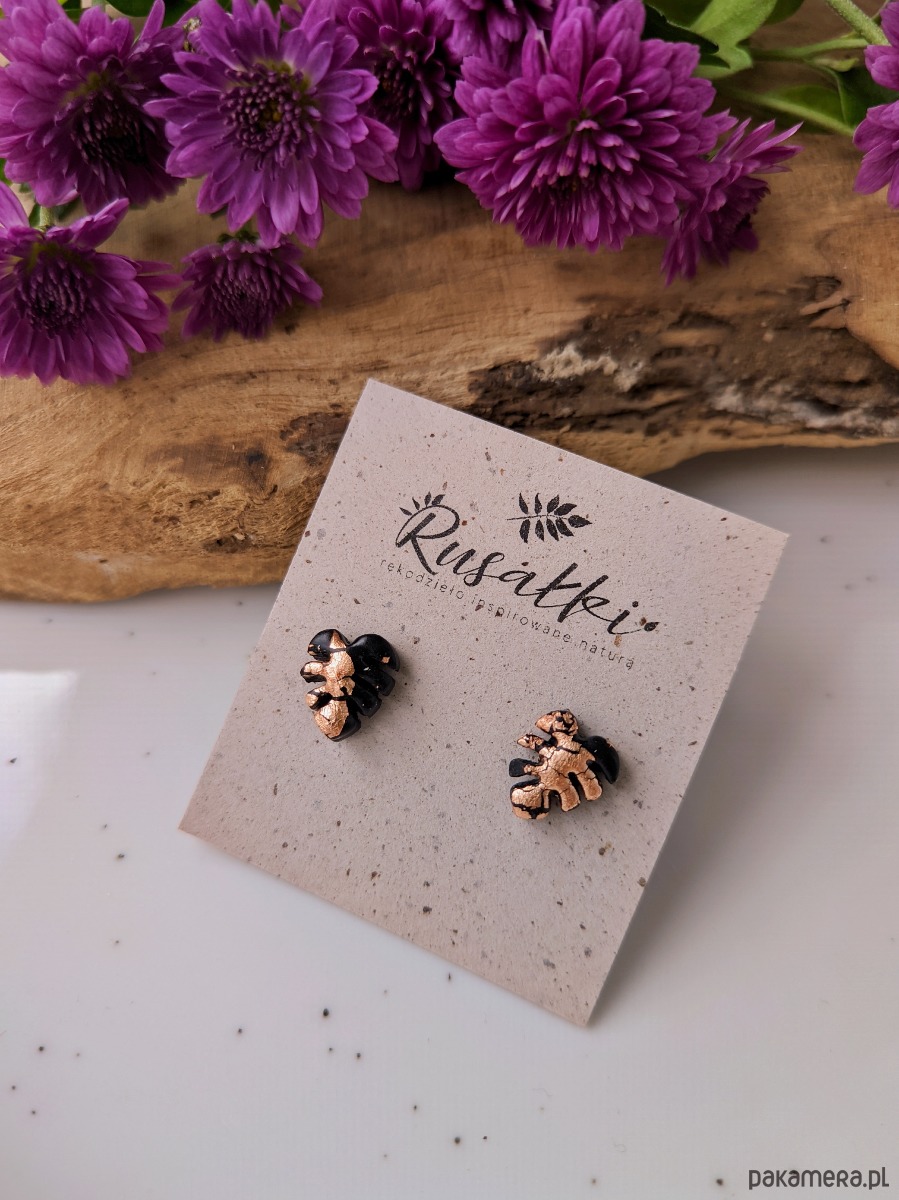 Monstery kolczyki w stylu glamour, sztyfty czarne liście marmurkowe