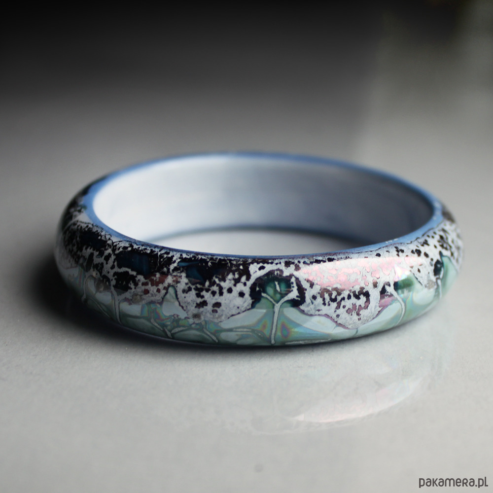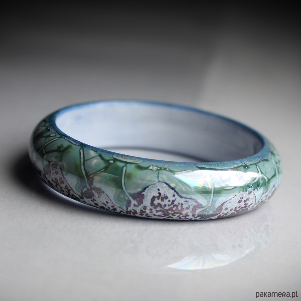 Efektowna, lekko nieregularna, ceramiczna bransoletka ręcznie wykonana najwyższej jakości porcelany, szkliwiona mieszanką zielonych i błękitnych szkliw z efektem plamek Średnica wewnętrzna około 5,8cm, szerokość około 1,5cm, grubość około 8mm