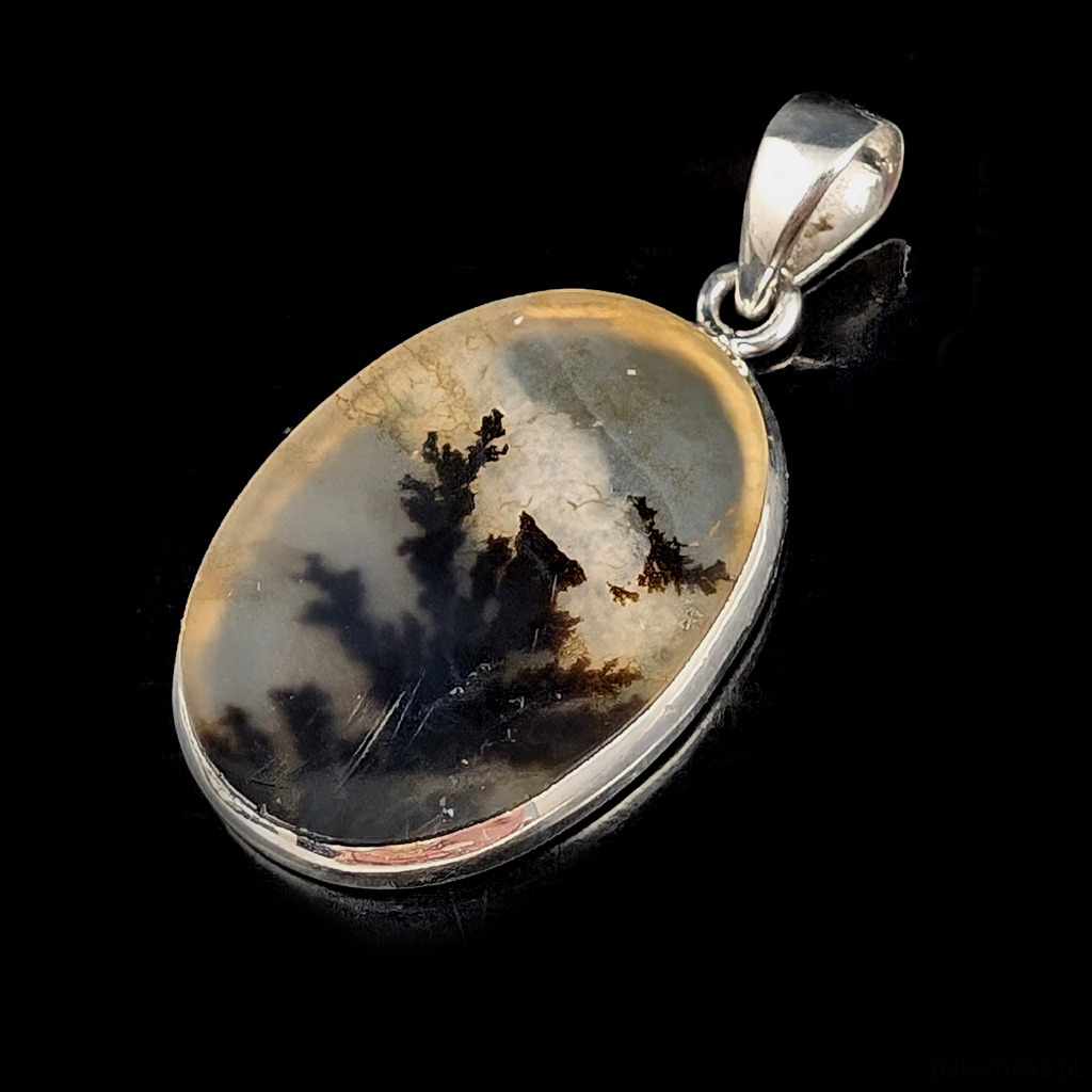 Wisiorek z agatem montana oprawionym  w srebro próby 925. Wymiary 30 x 23 mm, długość z krawatką 42 mm, waga 5,8 g. Wewnątrz kamienia piękne, naturalne malunki dendrytowe.Tyl wisiora otwarty Polecam w komplecie z pierścieniem. Wykonany przez dostawcę kamieni.