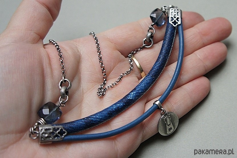 Naszyjnik wykonany własnoręcznie od podstaw i ze srebra [pr. 925], skórzanego rzemienia z naturalnej skórki [szer. 6mm i 3mm] w połączeniu z fasetowanymi poduszeczkami kwarcu blue london [10mm]. Srebro oksydowane i przetarte . Całkowita długość naszyjnika 57cm.Biżuteria ozdobnie zapakowana.