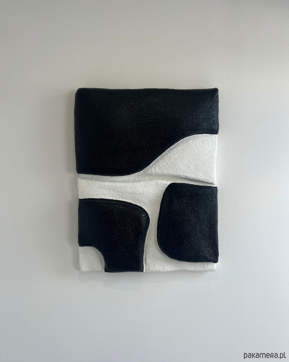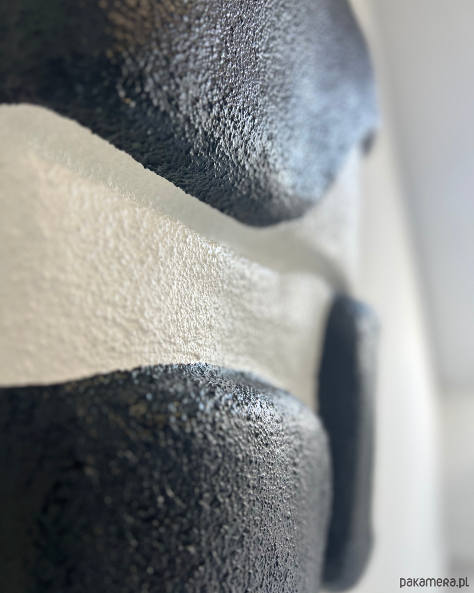 Statyczna eksplozja form, tekstur i głębi. Nasze unikatowe, ręcznie wykonane rzeźby ścienne zmieniają się w zależności od punktu widzenia obserwatora. Niektóre detale wydają się być ukryte, a po chwili stają się wyraźne i dominujące. Autorska mieszanka gipsu została wykorzystana w sposób, który doskonale imituje charakterystyczną strukturę tkaniny boucle. Delikatne “pętelki” i nierówności sprawiają, że rzeźba nabiera życia, tworząc efekt głębi i trójwymiarowości, jest pełna dynamizmu, choć w rzeczywistości pozostaje nieruchoma. Kolorystyka jest stonowana i naturalna, pasująca idealnie do estetyki wabi-sabi.