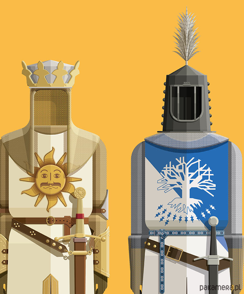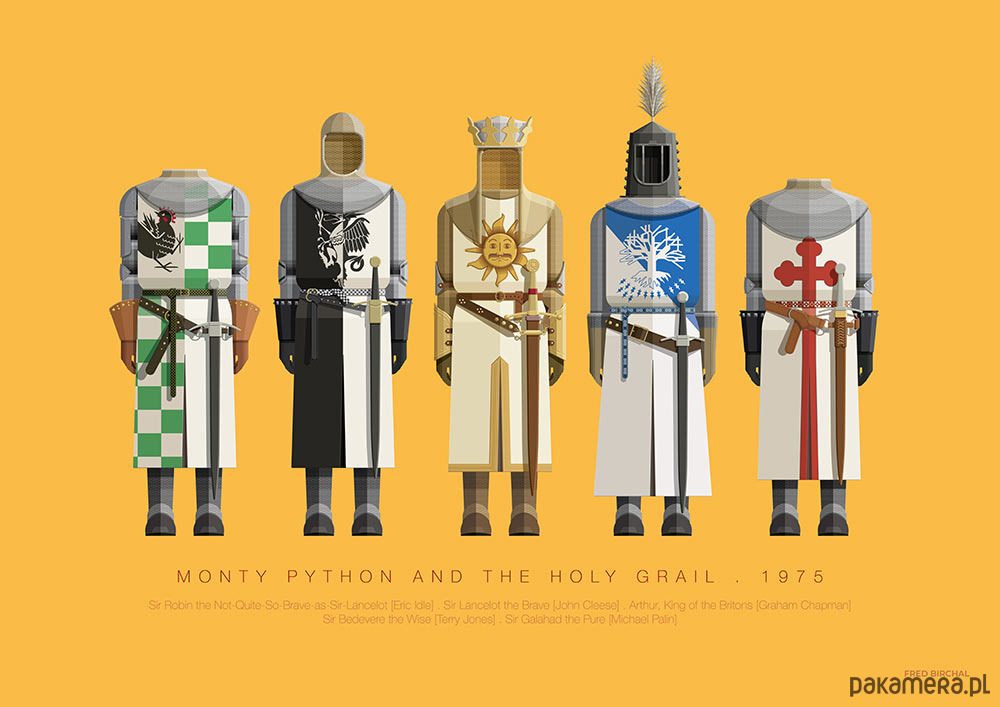 Plakat inspirowany filmem Monty Python i Święty Graal (Monty Python and the Holy Grail), reż. Terry Jones, Terry Gilliam. Grafika z kostiumami głównych bohaterów filmu, czyli bardzo dzielnych rycerzy, którzy w swej wyprawie musieli się zmierzyć m.in. z krwiożerczym królikiem. Dla każdego miłośnika szalonej twórczości grupy Monty Python pozycja obowiązkowa.