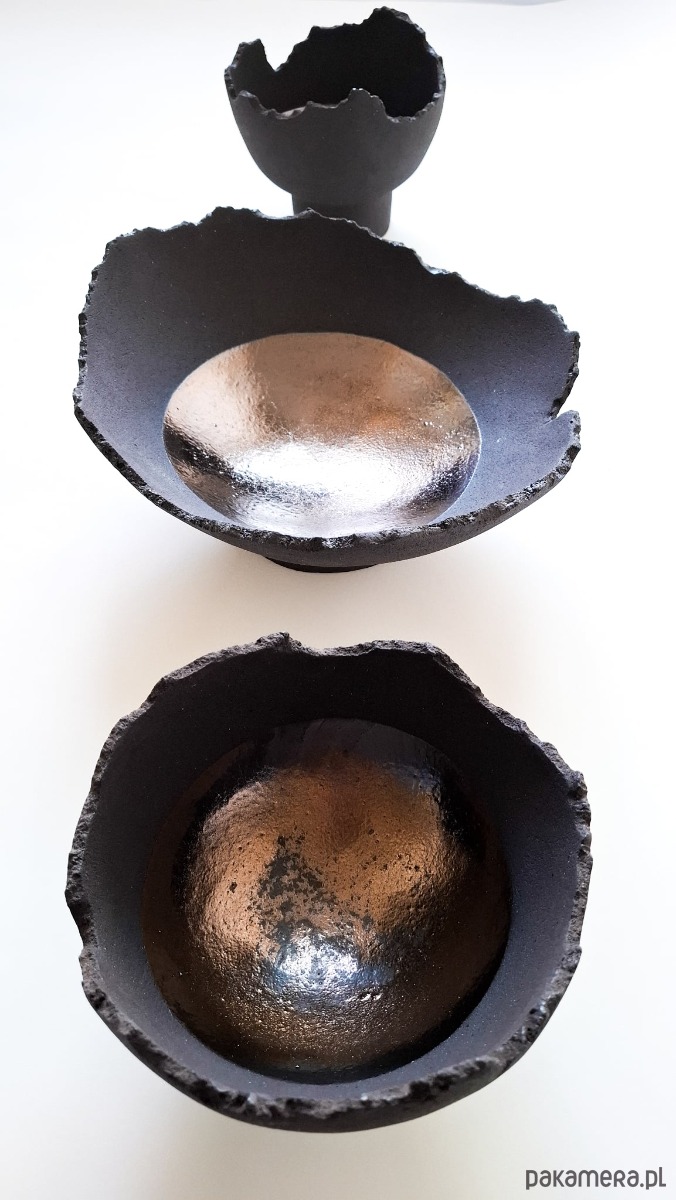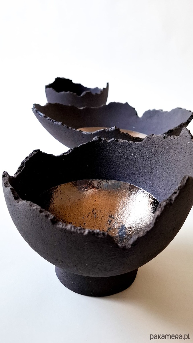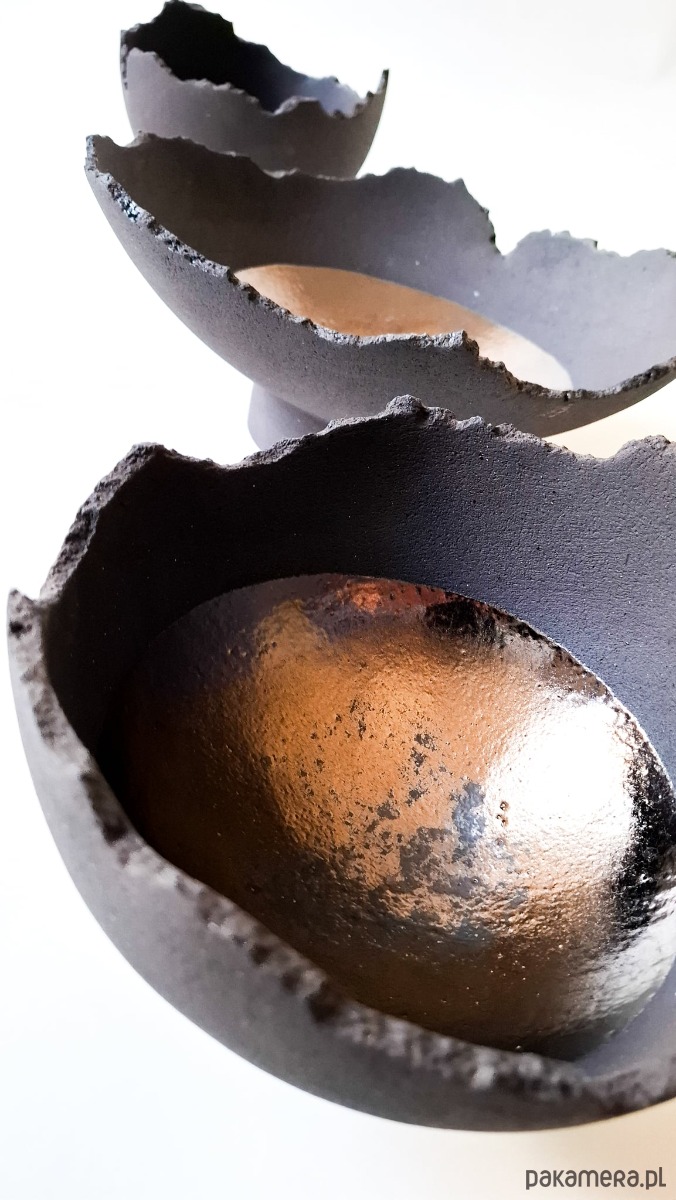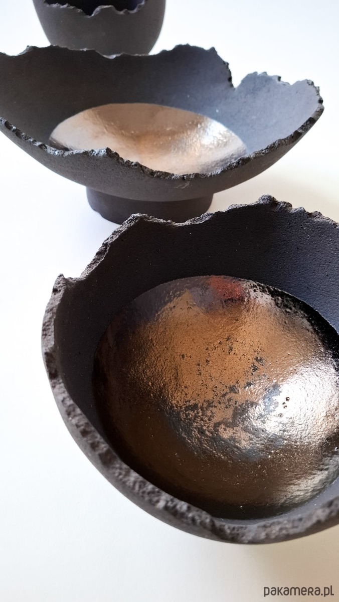 MOON bowls to zestaw 3 form wykonanych z antracytowej masy szamotowej o porowatej powierzchni, wypalone w temp. 1250 st. C. Dekoracją obiektów jest złote, efektowe szkliwo, tworzące na swojej powierzchni grę światła i cienia, płaszczyzn wyzłoconych i czarnych dziur.