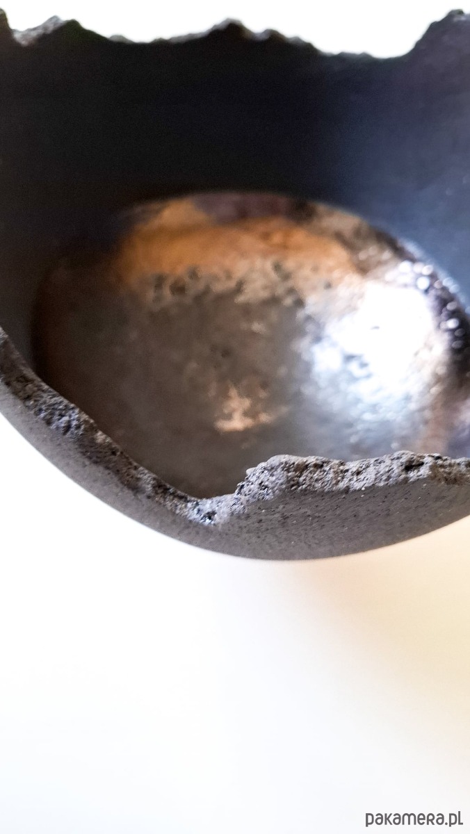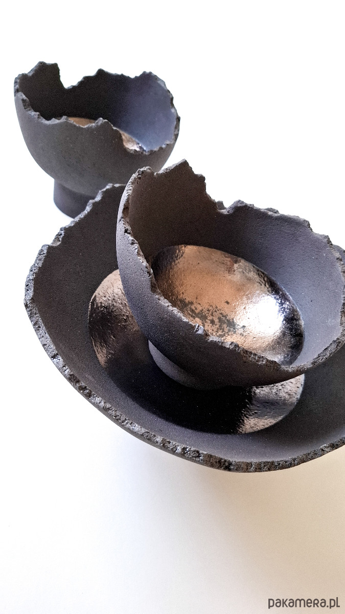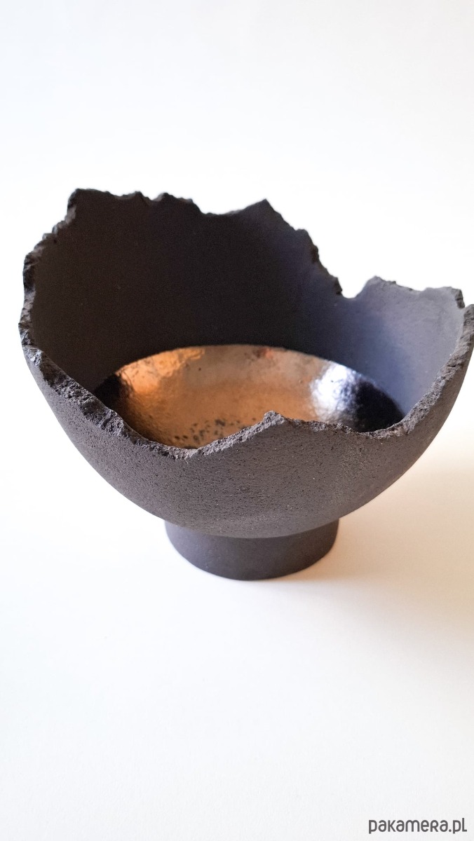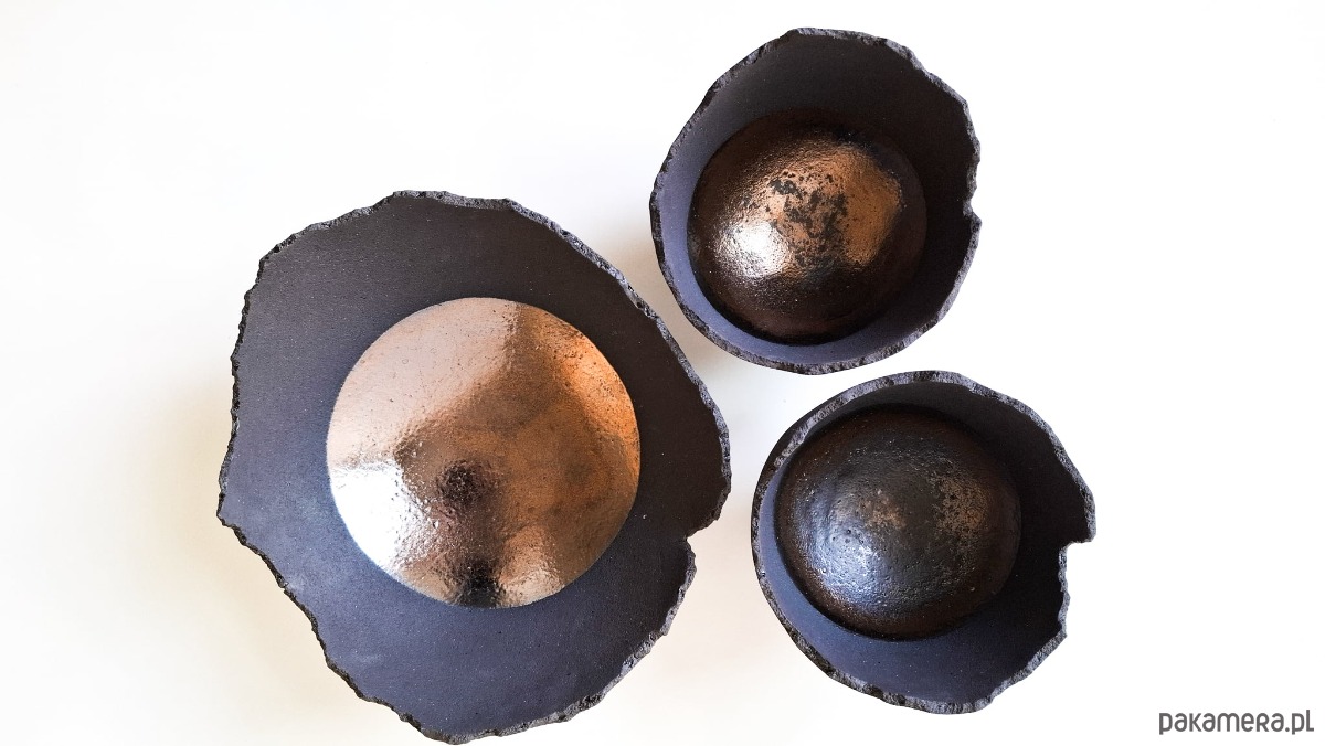 MOON bowls to zestaw 3 form wykonanych z antracytowej masy szamotowej o porowatej powierzchni, wypalone w temp. 1250 st. C. Dekoracją obiektów jest złote, efektowe szkliwo, tworzące na swojej powierzchni grę światła i cienia, płaszczyzn wyzłoconych i czarnych dziur.