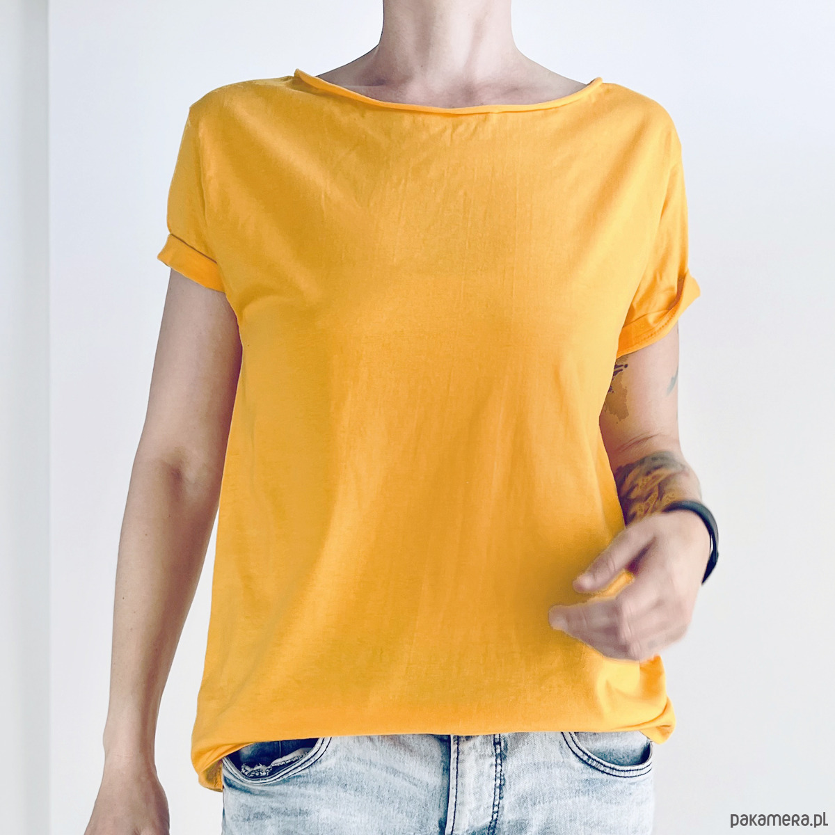 Gładki tshirt z ciętym dekoltem w odcieniu delikatnej moreli.