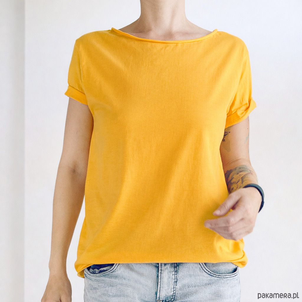 Gładki tshirt z ciętym dekoltem w odcieniu delikatnej moreli.