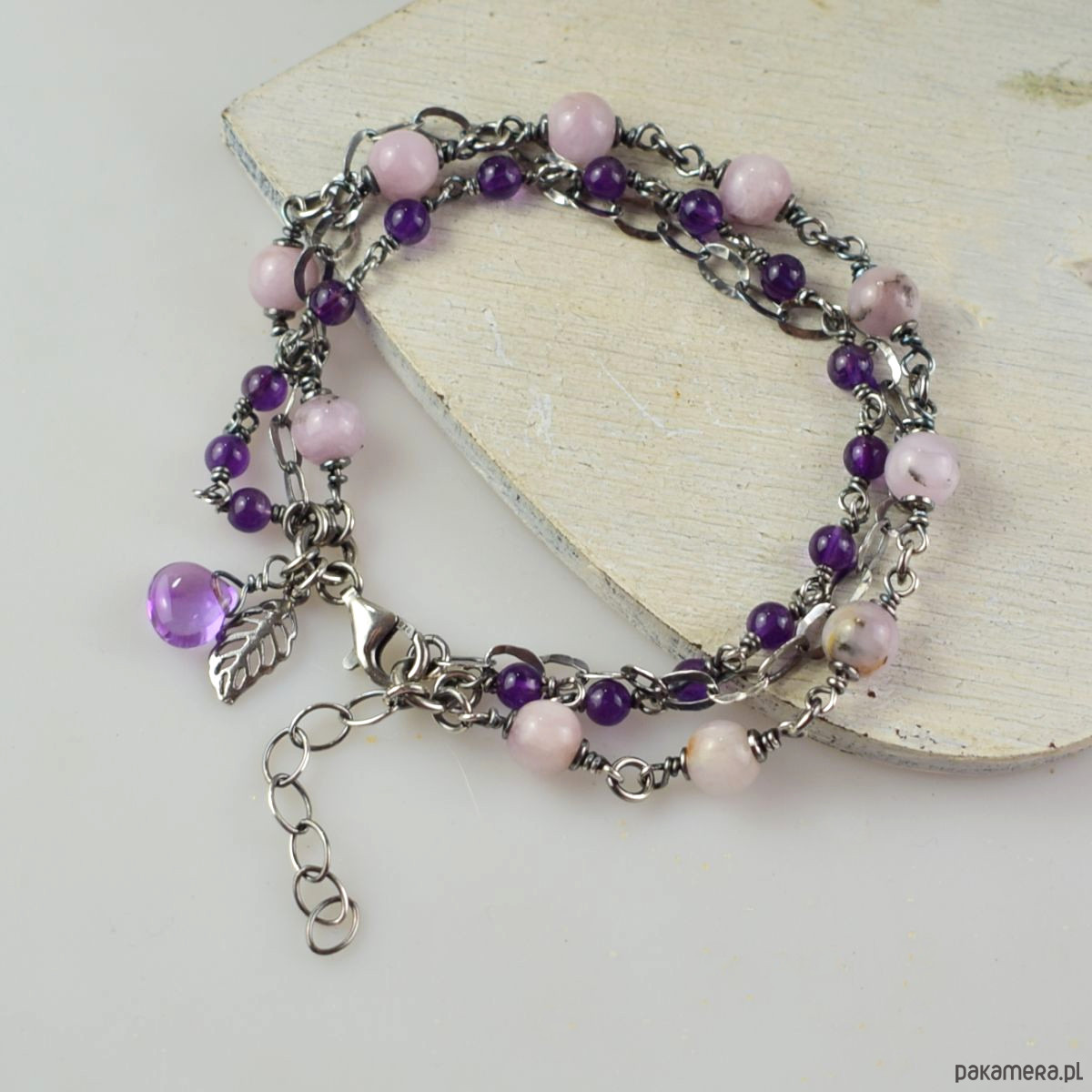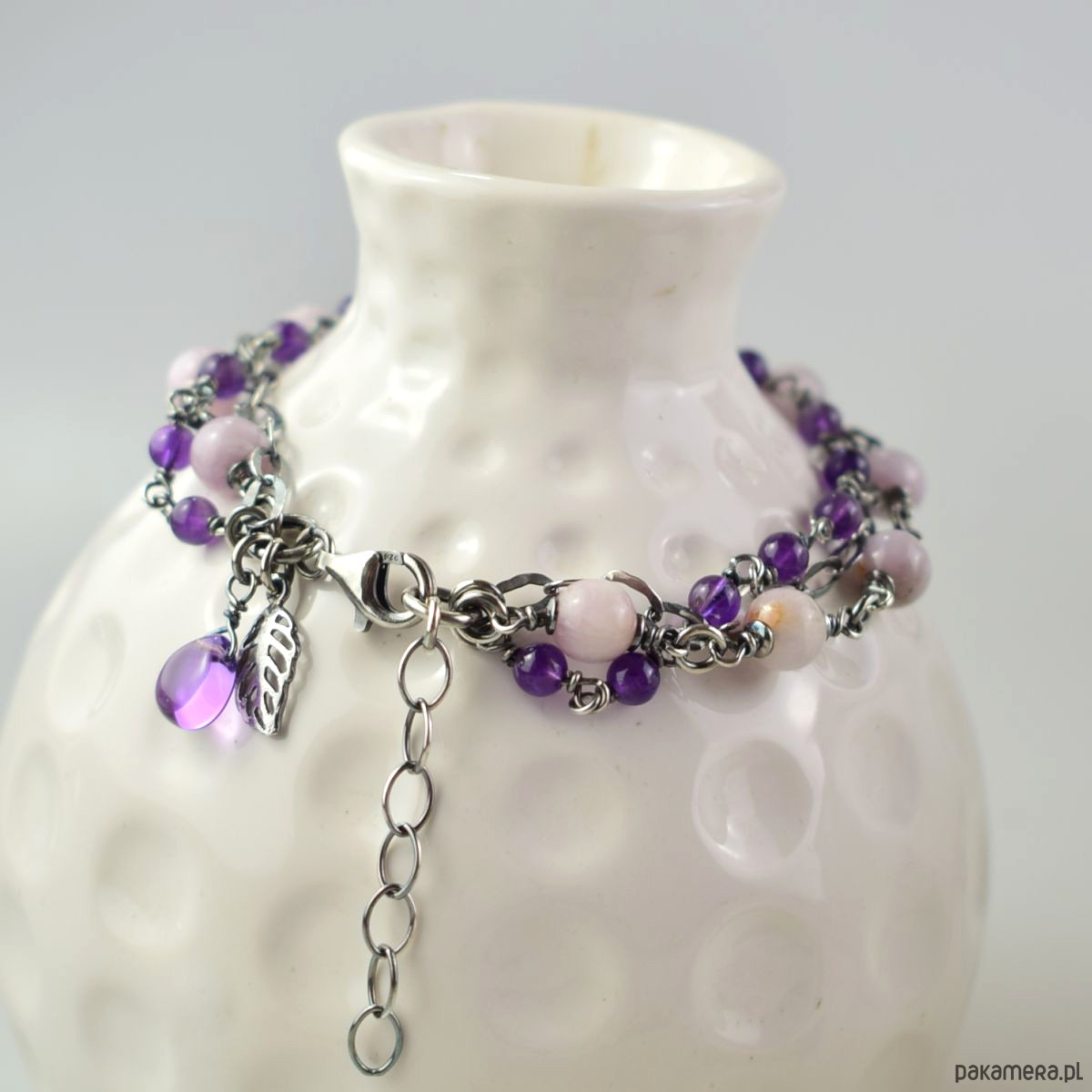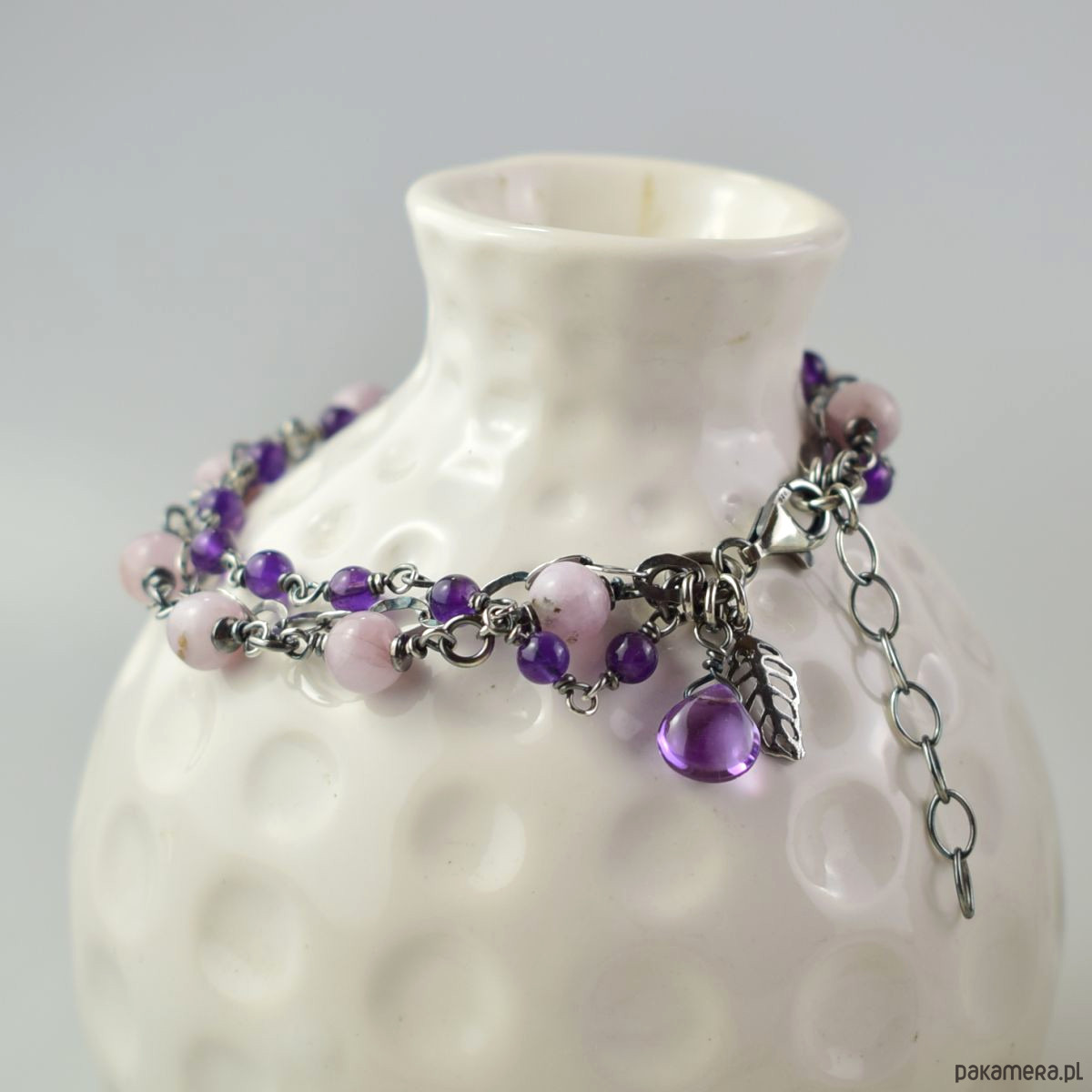 Bransoletka wykonana w całości ze srebra (próba 925) z ametystem i morganitem. Całość została zoksydowana (przyciemniona) i wypolerowana. Długość regulowana 19 - 22 cm. Biżuteria zostanie ozdobnie zapakowana.