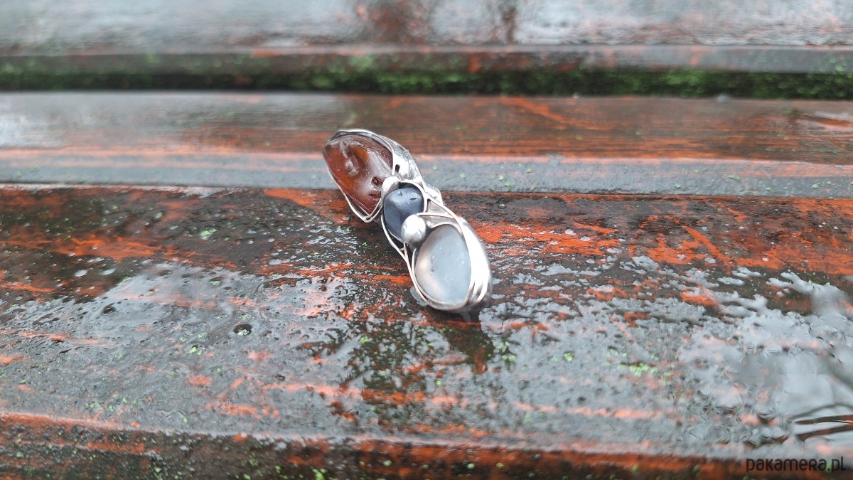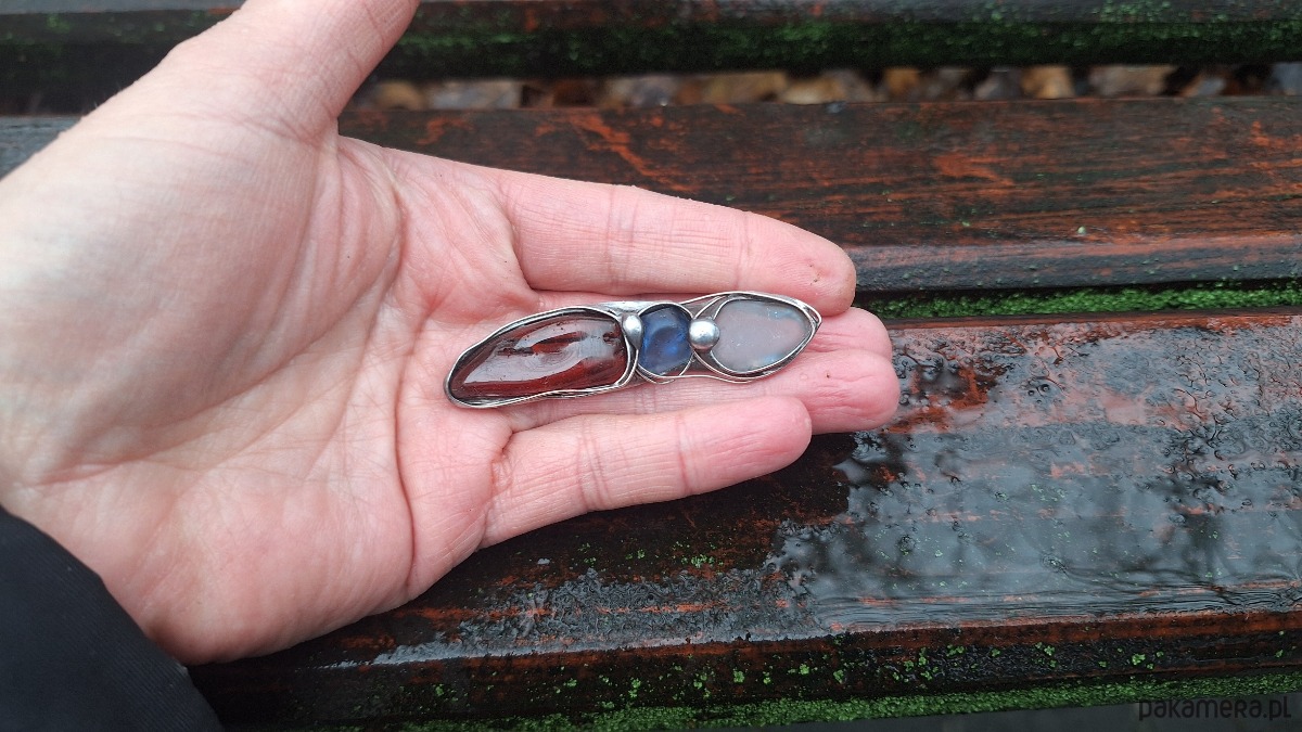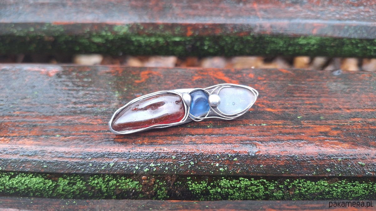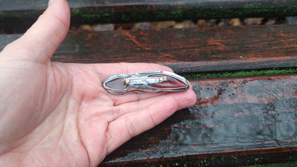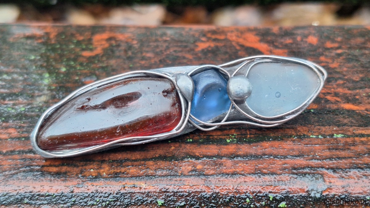 Broszka wykonana z miedzi, cyny, szkła i bursztynu. Wymiary ok. 6 na 1.5 m. Zapięcie metalowe.