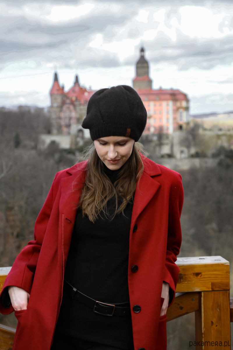 Uwaga: Modelka pozuje w czarnej czapce.