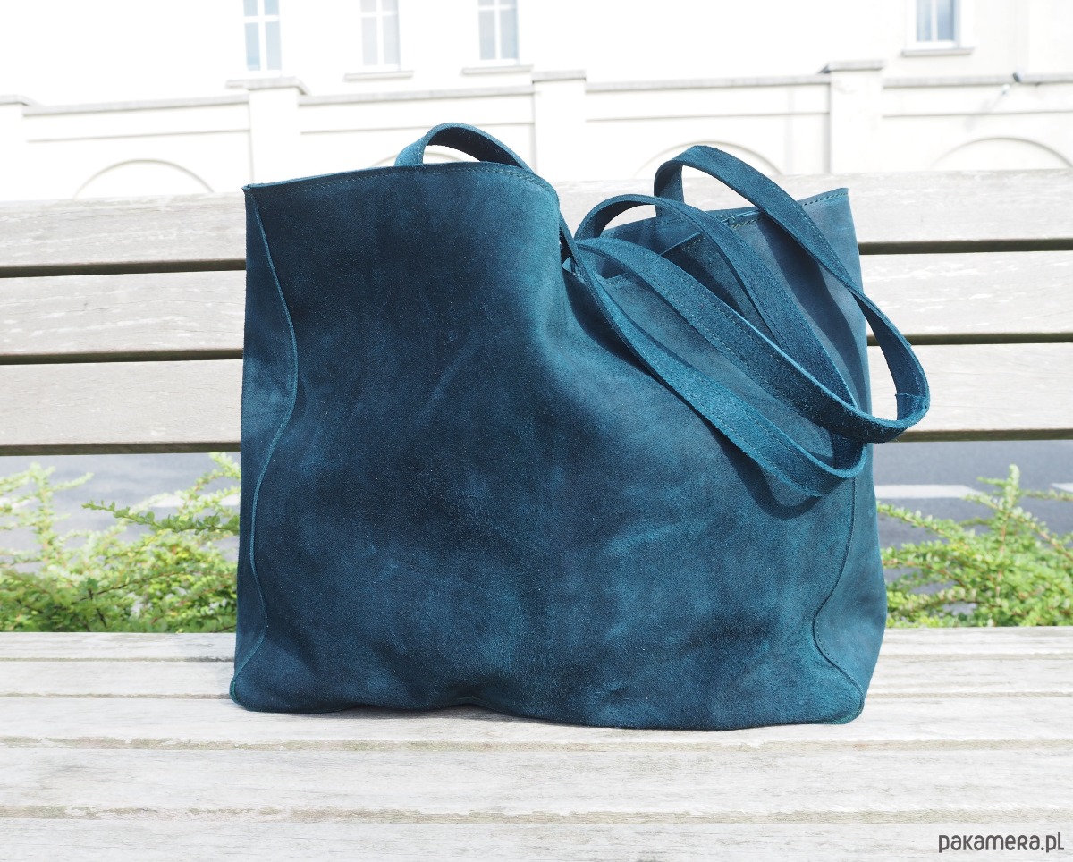 Wyjątkowa, duża torba z naturalnego zamszu w pięknym morskim odcieniu. Uszyta ze skóry, naturalne- grubszego miękkiego zamszu.
