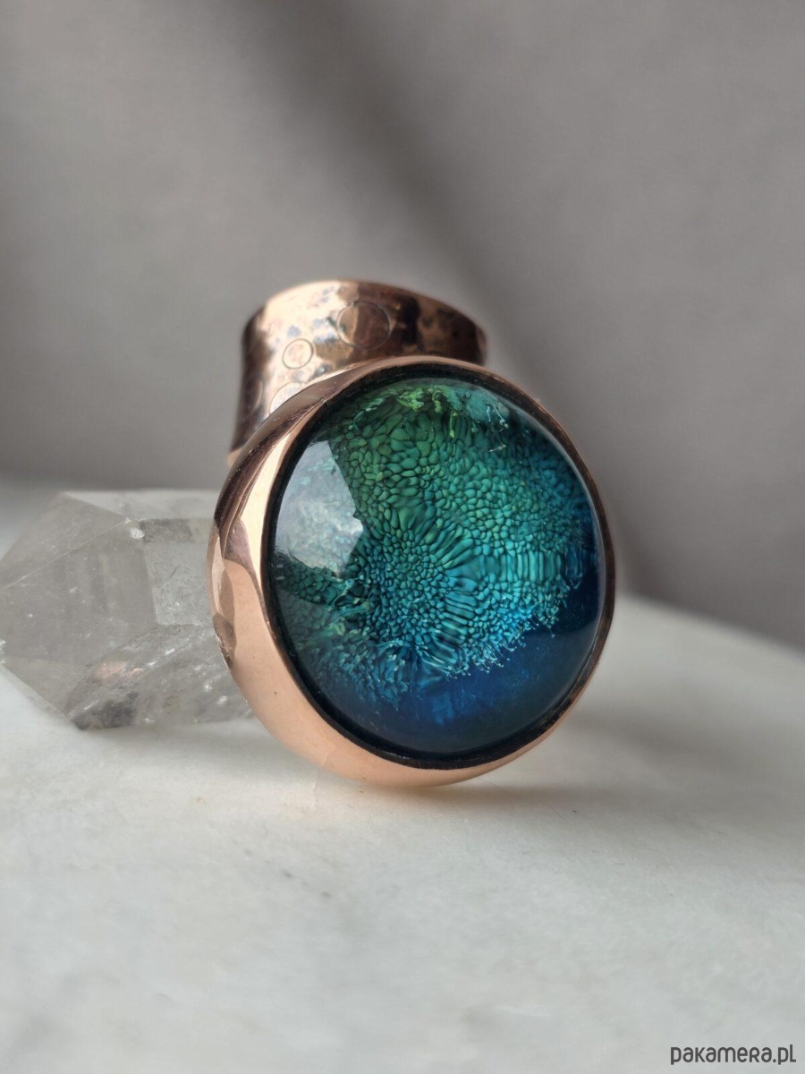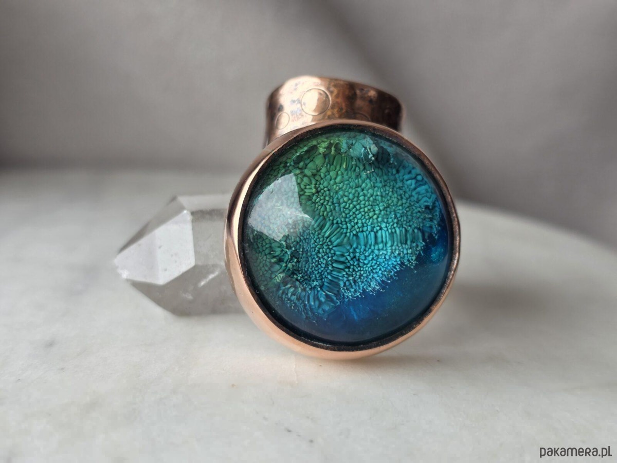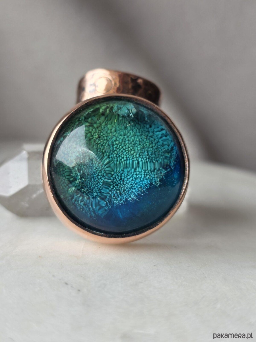 Użyte materiały: miedź, kaboszon wykonany ręcznie z żywicy epoksydowej
