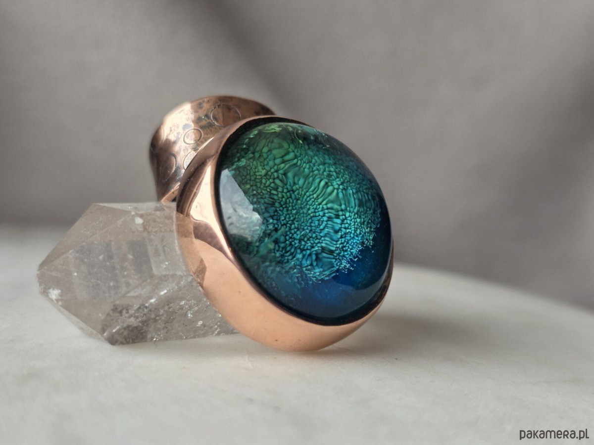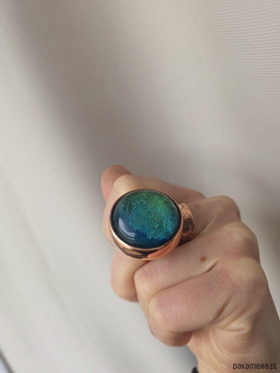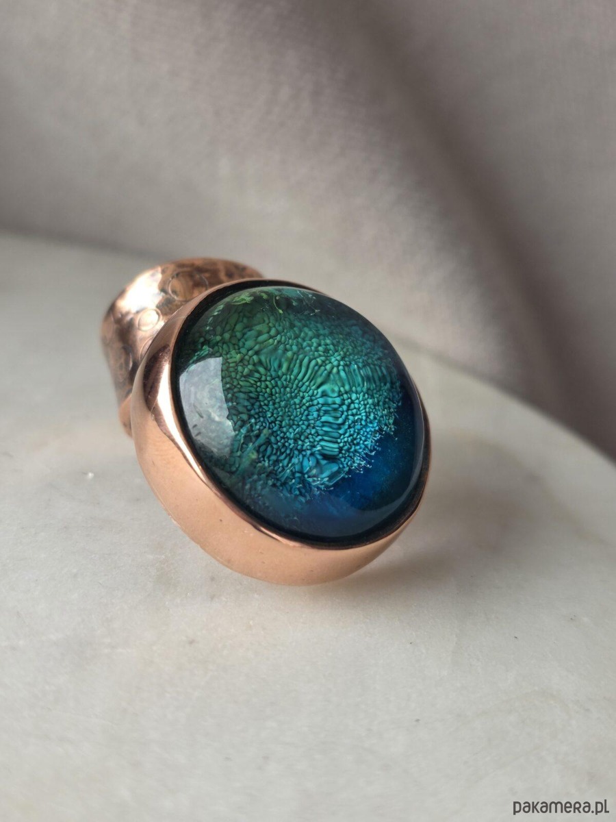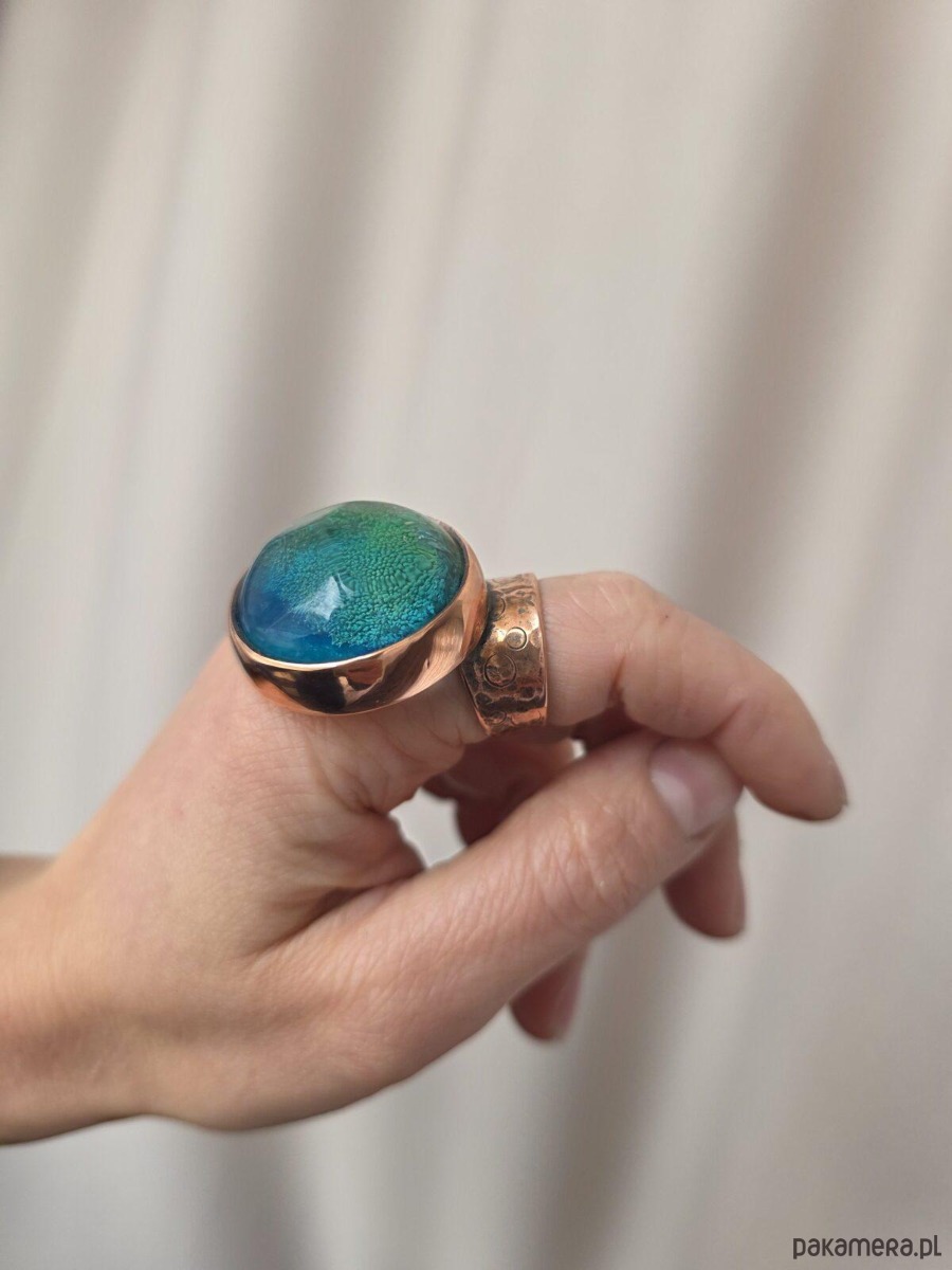 Użyte materiały: miedź, kaboszon wykonany ręcznie z żywicy epoksydowej