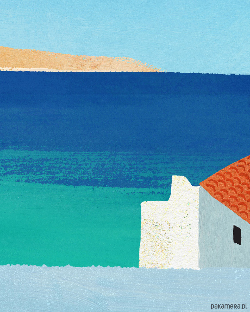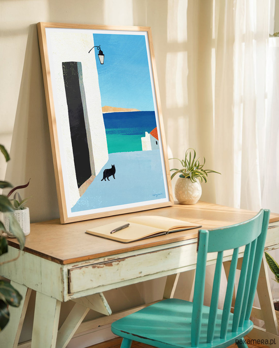 Ten wakacyjny plakat to dekoracja dla każdego, kto kocha letnie podróże. Nadmorskie miasteczko zagubione gdzieś na południu Europy, turkusowa tafla wody i czarny kot wybierający się na swoją kocią przechadzkę.