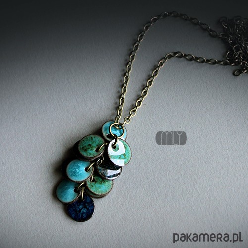 Podłużny ceramiczny wisior, ręcznie wykonany z delikatnej gliny kamionkowej, elementy jednostronnie szkliwione efektownym błyszczącą mieszanką szkliw z efektem plamek, zawieszony na łańcuszku w kolorze starego złota o efektownym splocie. Długość zawieszki ok. 5cm, długość łańcuszka 2x28cm - na życzenie możliwość regulacji długości. Polecam
