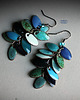 Oryginalne i efektowne ceramiczne kolczyki w formie gronek, ręcznie wykonane z mocno spieczonej czekoladowobrązowej gliny kamionkowej, jednostronnie szkliwione mieszanką błyszczących zielonych i błękitnych szkliw z efektem plamek, na biglach ze stali chirurgicznej w kolorze srebra. Długość około 5cm. Polecam