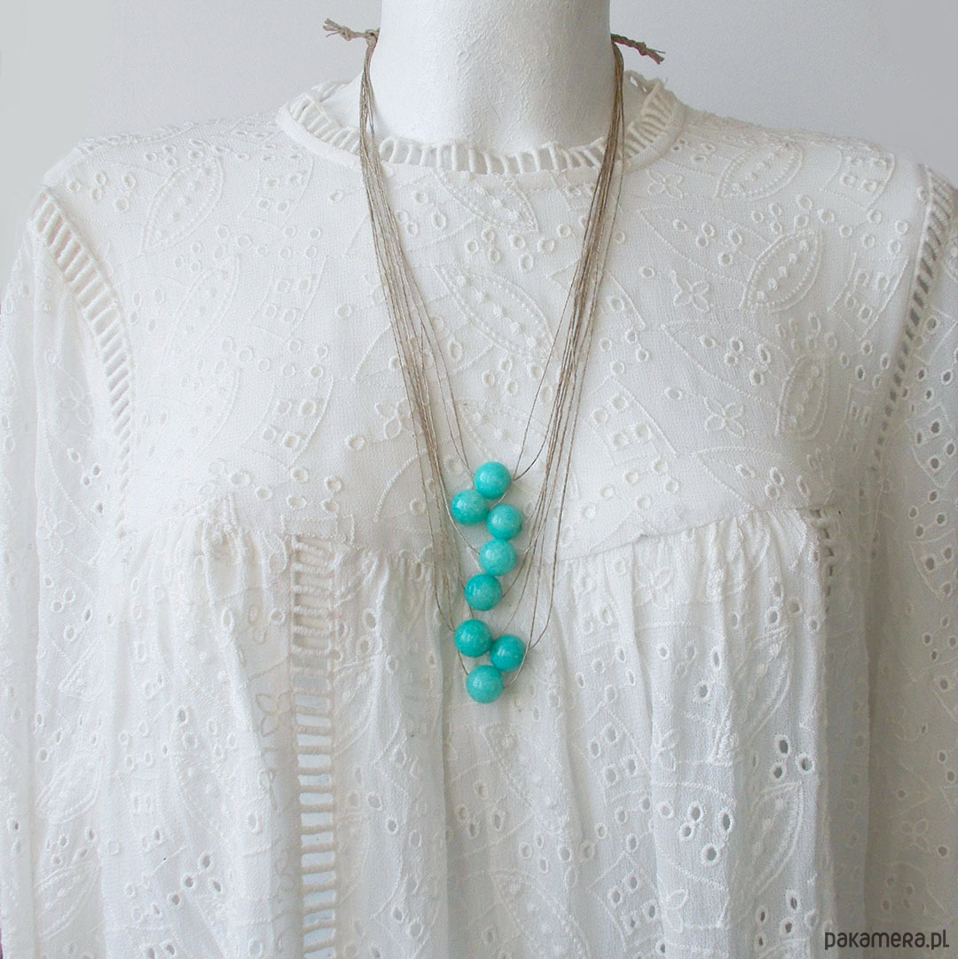 Lniany naszyjnik z kulkami jadeitu w pięknym kolorze jasnego turkusu