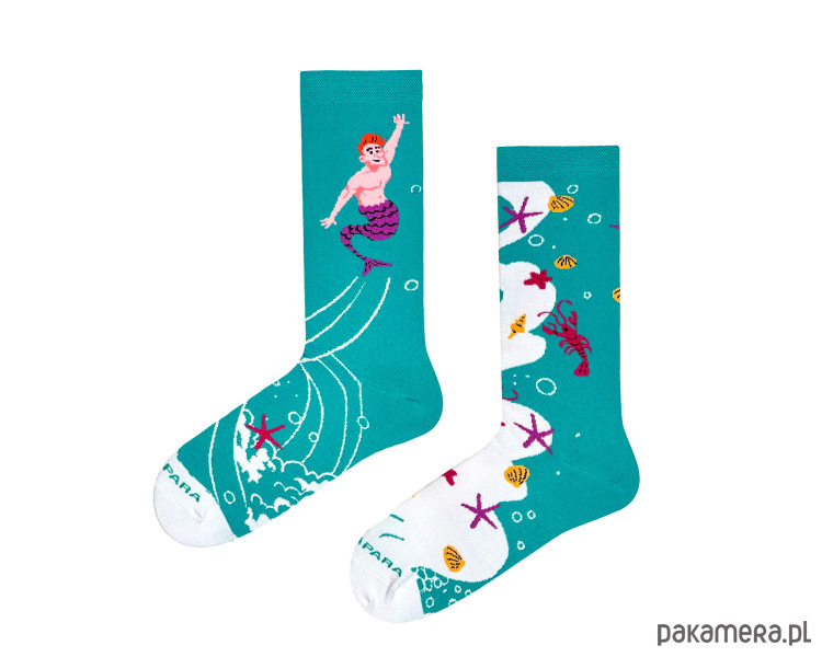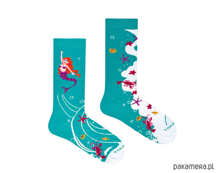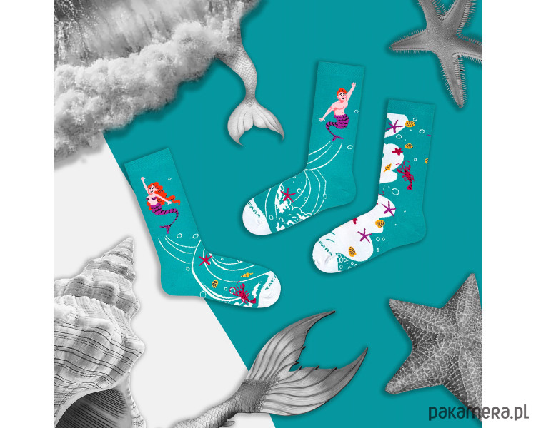 Oto Twoje bilety do podwodnego raju. Nasze skarpetki Pan i Pani Syrenka od Takapara to prawdziwe arcydzieło. Wykonane z wysokiej jakości bawełny w Łodzi, te skarpetki są wyjątkowo wytrzymałe i odporne na przetarcia. Pierwsza skarpetka ukazuje nam atletycznego mermana, który wygląda jak wyciągnięty z filmu Disneya, tańczącego z urokliwą rudowłosą syrenką. Za to druga przenosi nas w wirujący taniec muszelek, rozgwiazd i krabów. Wszystko to tworzy harmonijny i urokliwy obraz, jakbyśmy oglądali podwodny balet. Ciekawostka: w mitologii syreny morskie były uważane za istoty, które potrafiły zauroczyć marynarzy swoim śpiewem. Nie przegap okazji, by dodać odrobinę magii do swojej garderoby!