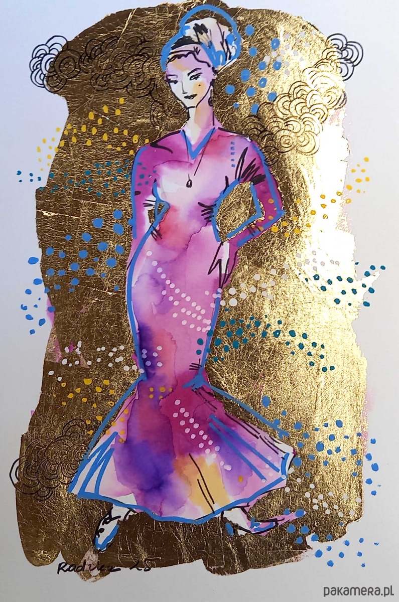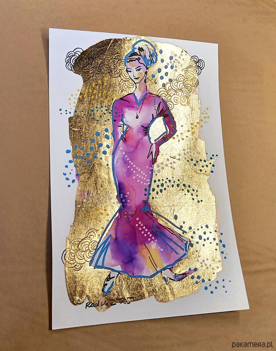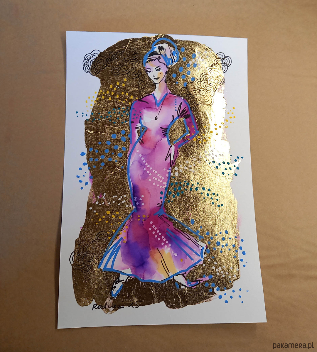 Akwarela formatu 16x24 cm wykonana za pomocą ecoline Talensa oraz złotych płatków szlagmetalu, z dodatkiem kaligraficznych pisaków Kuretake na profesjonalnym papierze akwarelowym Talens 300 g/m2.
