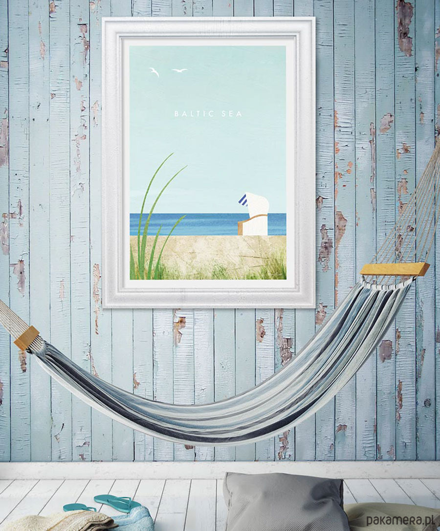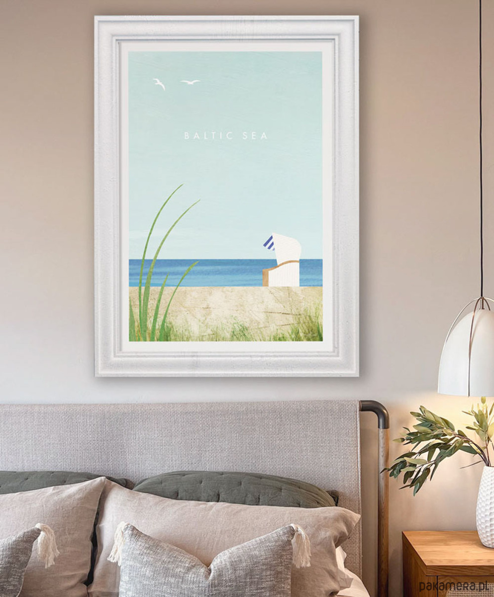 Plakat podróżniczy w stylu retro - widok na opustoszałą plażę nad Morzem Bałtyckim. Spokojny krajobraz wakacyjny z charakterystycznym wiklinowym koszem, w którym można zatopić się czytając wakacyjną lekturę i słuchając szumu fal. Plakat Morze Bałtyckie pięknie ozdobi każde wnętrze, zarówno salon w mieszkaniu, jak i pokój w pensjonacie i hotelu.