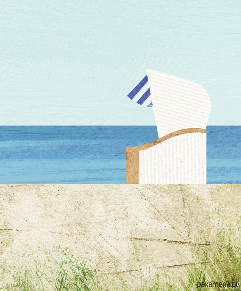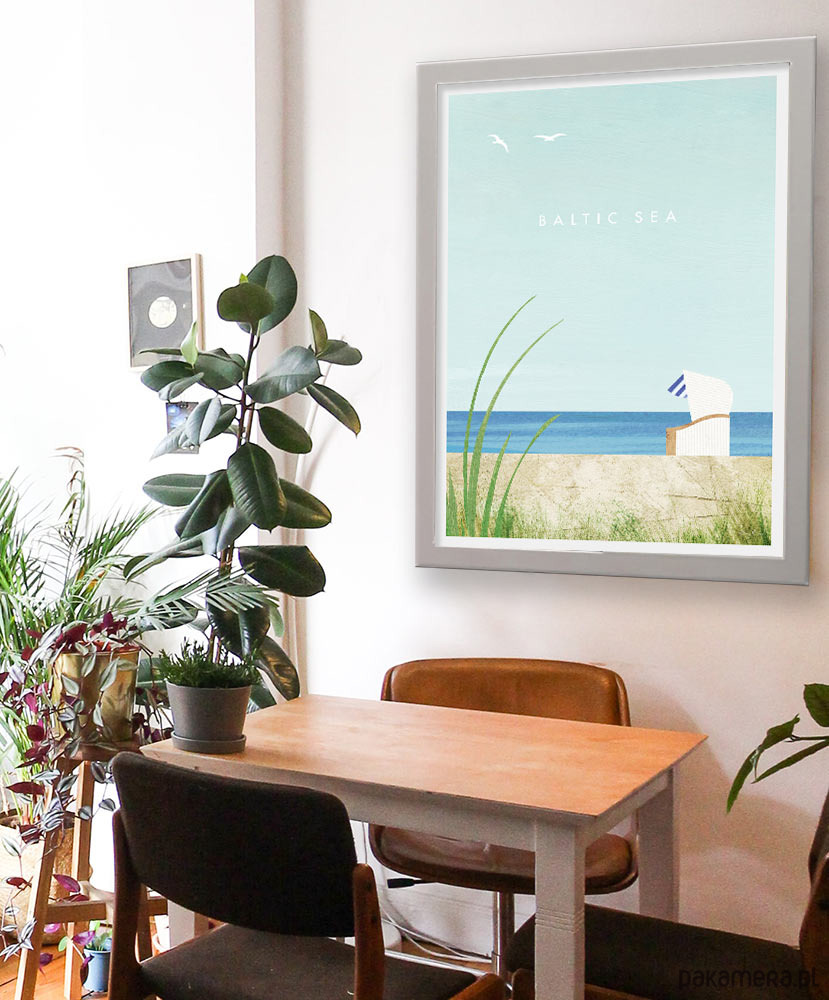 Plakat podróżniczy w stylu retro - widok na opustoszałą plażę nad Morzem Bałtyckim. Spokojny krajobraz wakacyjny z charakterystycznym wiklinowym koszem, w którym można zatopić się czytając wakacyjną lekturę i słuchając szumu fal. Plakat Morze Bałtyckie pięknie ozdobi każde wnętrze, zarówno salon w mieszkaniu, jak i pokój w pensjonacie i hotelu.
