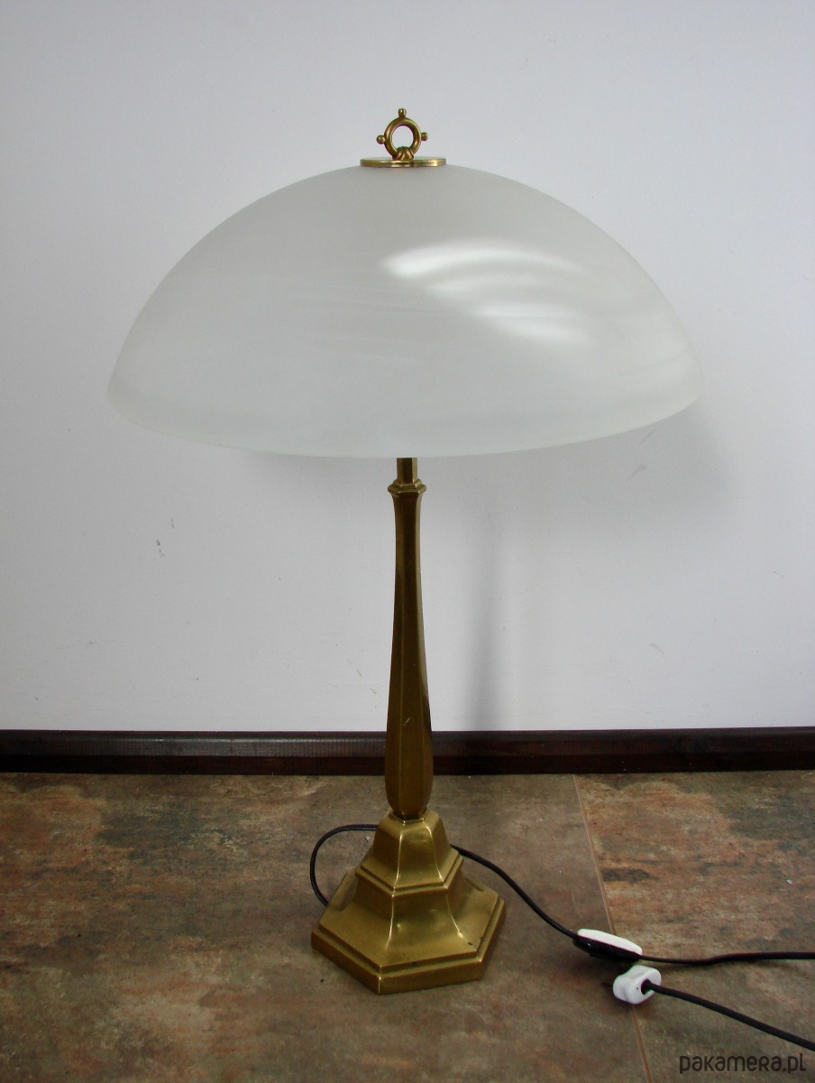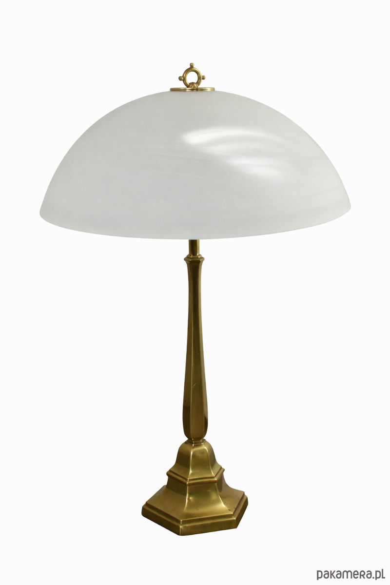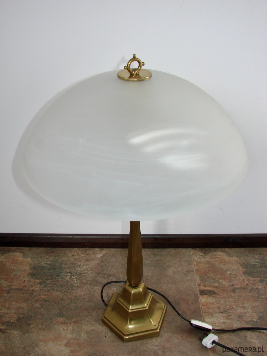 Konstrukcja została wykonana z mosiądzu, co nadaje jej ciepły, luksusowy odcień. Duży, efektowny klosz ze szkła o średnicy 40 cm pięknie rozprasza światło, tworząc miękką i elegancką atmosferę we wnętrzu.